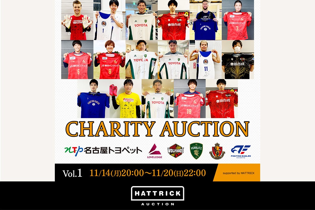 この度、「HATTRICK」にてNTP名古屋トヨペットが主催するチャリティーオークションは、愛知県を本拠地に活動する「ファイティングイーグルス名古屋」「名古屋グランパス」「ウルフドッグス名古屋」「トヨタヴェルブリッツ」「朝日インテック・ラブリッジ名古屋」の5つのプロスポーツ団体が、日頃よりチームや選手に支援いただいているファンやサポーター、地域の方々やステークホルダーの皆さまへ感謝の想いを持って参加。本オークションでは、5つのプロスポーツ団体に所属する選手たちが、試合や練習で実際に使用している貴重なアイテムに、直筆サインを入れてお届けします。そして本企画での収益は、NTP名古屋トヨペットより中日新聞社会事業団の「年末助け合い運動」へ寄託し、生活保護家庭の小・中学生にお年玉を贈るほか、各福祉事業の助成資金の一部として活用されます。