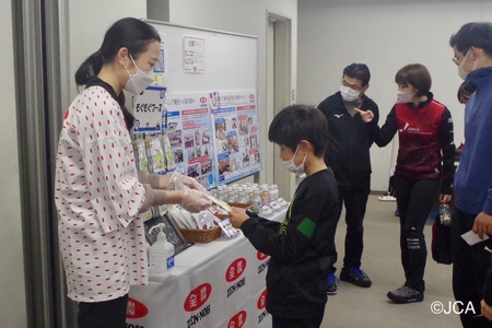 全農は会場に「もぐもぐブース」を設置しました。「もぐもぐブース」は全農日本カーリング選手権大会やジュニアカーリング選手権大会などでも恒例となっている、出場選手の皆さん向けにエネルギー補給用の飲食を提供するブースです。参加者は参加賞と一緒に配られた「もぐもぐブース引換券」と交換で好きな商品を受け取り、国内最高峰の大会で活躍するアスリート同様に「ニッポンの食」でエネルギーを補給しました。この「もぐもぐブース」には全農の商品ブランド“ニッポンエール”の「広島県産はっさく&レモン グミ」や「ひろしま 米粉バウムクーヘン」など開催地・広島県に関連した商品や、11月1日に販売開始したばかりの「日本の酪農を応援シリーズ」の新商品「抹茶ミルク」もラインナップし、参加者は楽しんで商品を選んでいました。