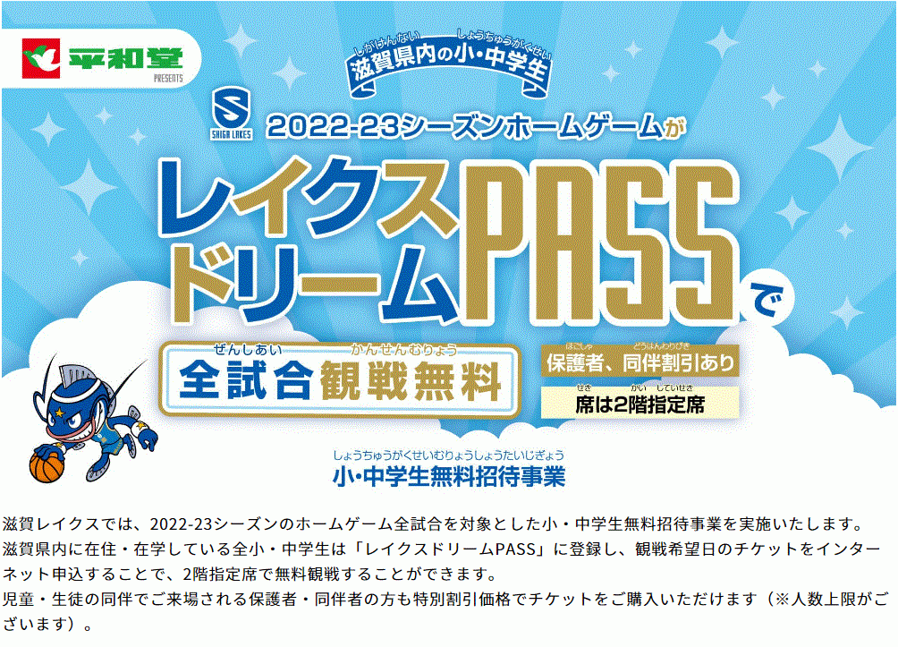 滋賀県内に在住・在学している全小・中学生を対象に「平和堂 presents レイクスドリームPASS」に登録し、観戦希望日のチケットをインターネット申込することで、2階指定席で無料観戦することができます。