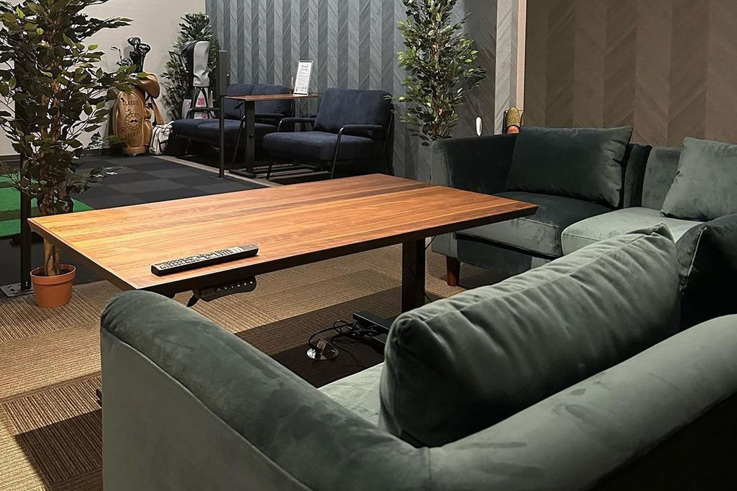 シミュレーションゴルフ設備の隣には、ラグジュアリーなリラックススペースをご用意しています。一人で練習をした後、動画を再確認しながらのんびりくつろぐ。そんな時間も大切にしています。