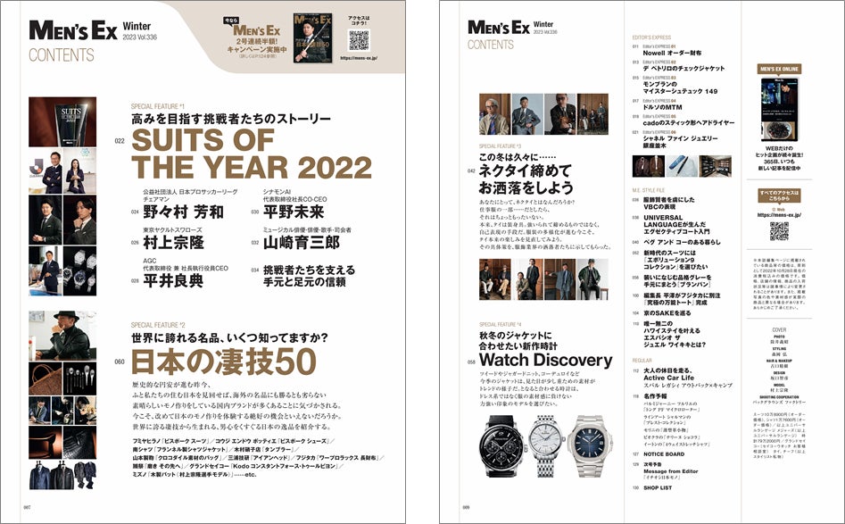 株式会社Beginは、『MEN’S EX Winter 2023』を11月16日(水)に発売しました。「SUITS OF THE YEAR 2022(スーツ・オブ・ザ・イヤー)」スポーツ部門を受賞した、東京ヤクルトスワローズ村上宗隆選手を表紙に迎え、単独インタビューを掲載しました。また特集「日本の凄技50」では、村上選手のバットを手掛けた名工に、栄光の生まれた裏話を聞きました。