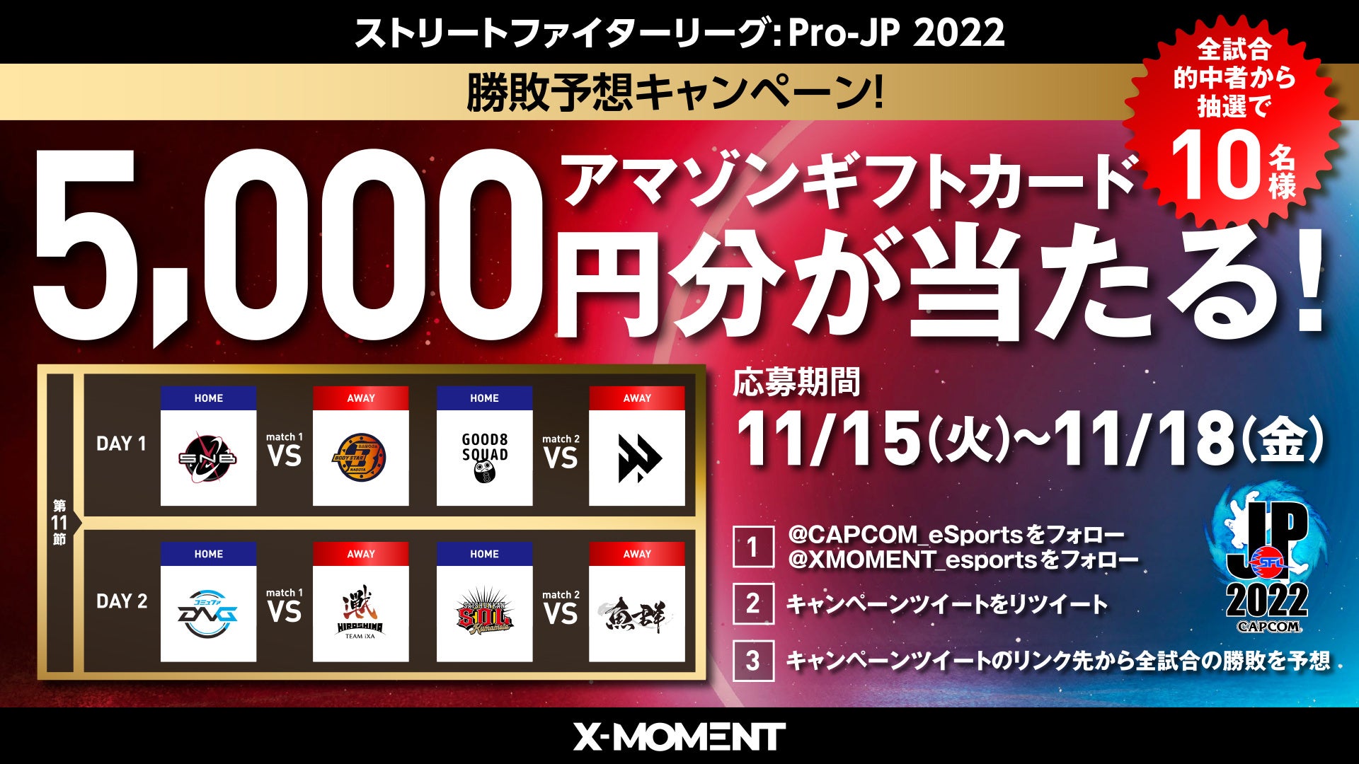 「ストリートファイターリーグ: Pro-JP 2022」第11節で行われる全4試合の勝敗結果を予想して、キャンペーン入力フォームで各試合の勝利チームを選択してください。