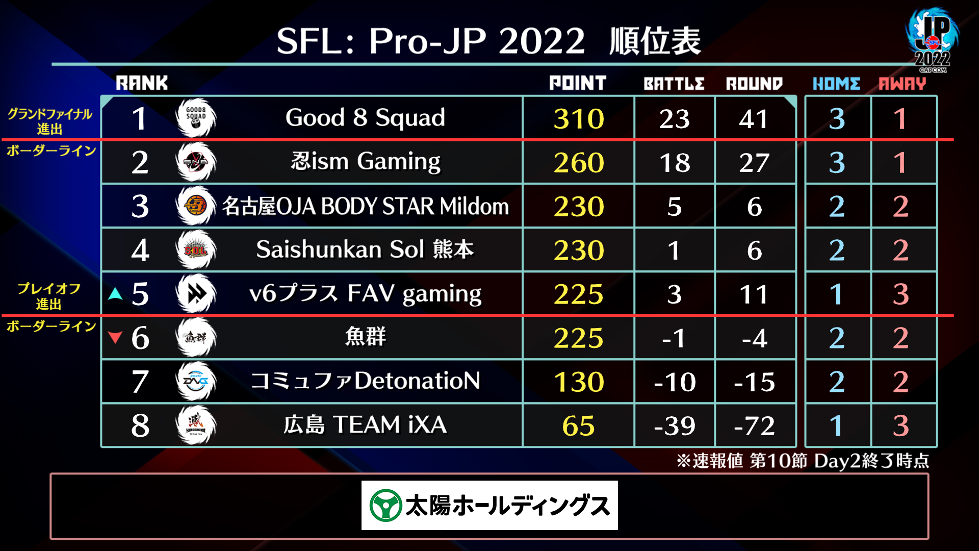 ホーム戦で40ポイントを獲得した「v6プラス FAV gaming」はプレイオフ進出ボーダーラインとなる5位に浮上。2021シーズン王者の底力を見せた試合となった。