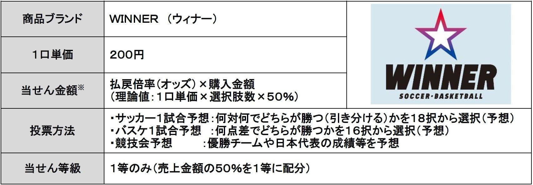 日本でスポーツを対象にしたくじを販売できるのは、法律で日本スポーツ振興センターのみとされています。「WINNER」は日本スポーツ振興センターが初めて出す、1試合を対象にしたくじのため、「日本初」の表現を使用しております。