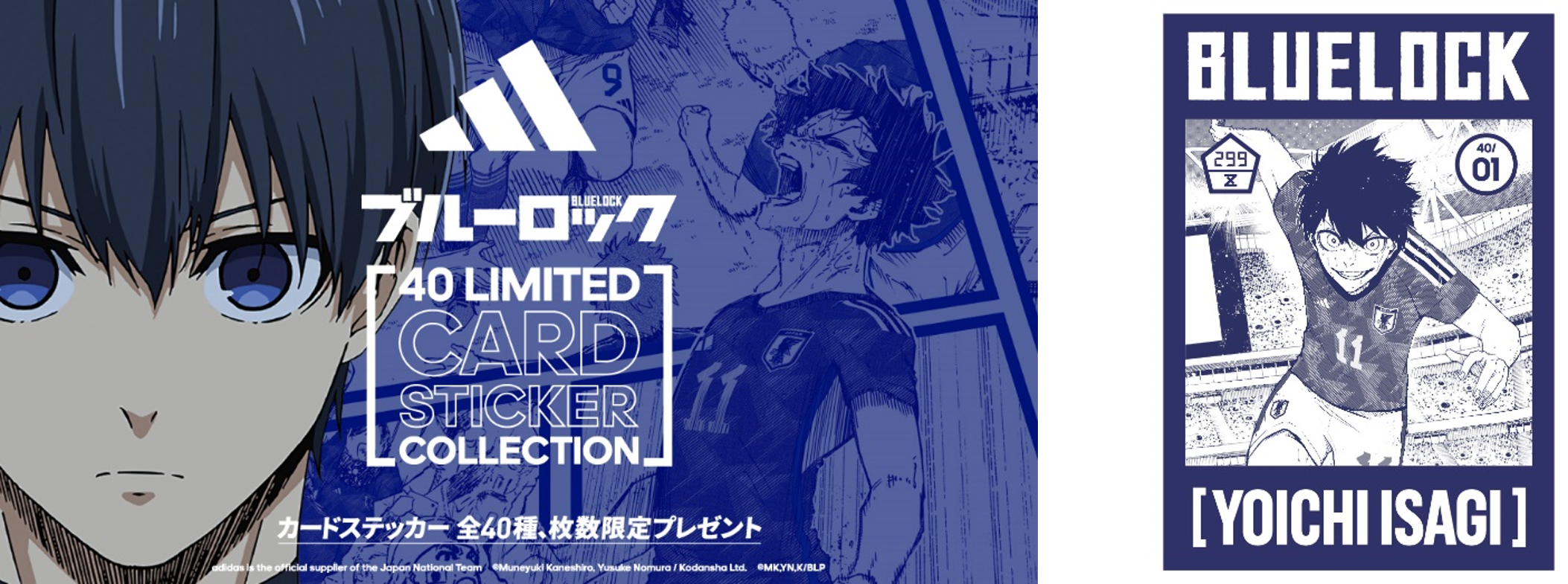 FIFAワールドカップ 2022へ向け、アディダスが人気サッカー漫画/アニメ『ブルーロック』と再びタッグを組んだキャンペーンが11月1日(火)よりスタートしています。全国約700店舗のアディダスお取り扱い店舗および直営店舗にてアディダス『プルーロック』人気キャラクターが勢ぞろいしたトレーディングカード型オリジナルカードステッカー(5枚一組)がもらえるキャンペーンとなっています。(※5枚を選ぶことはできません。)
