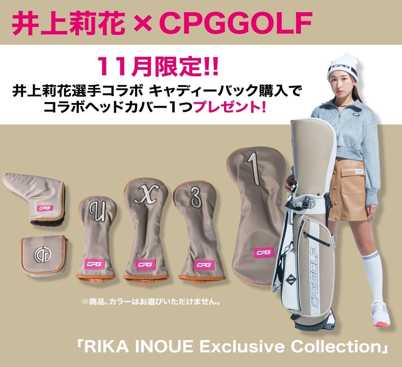 11月限定で、”井上莉花プロ”コラボレーション キャディーバックをご購入のお客様にお好きなコラボヘッドカバー(1つ)をプレゼントいたします。