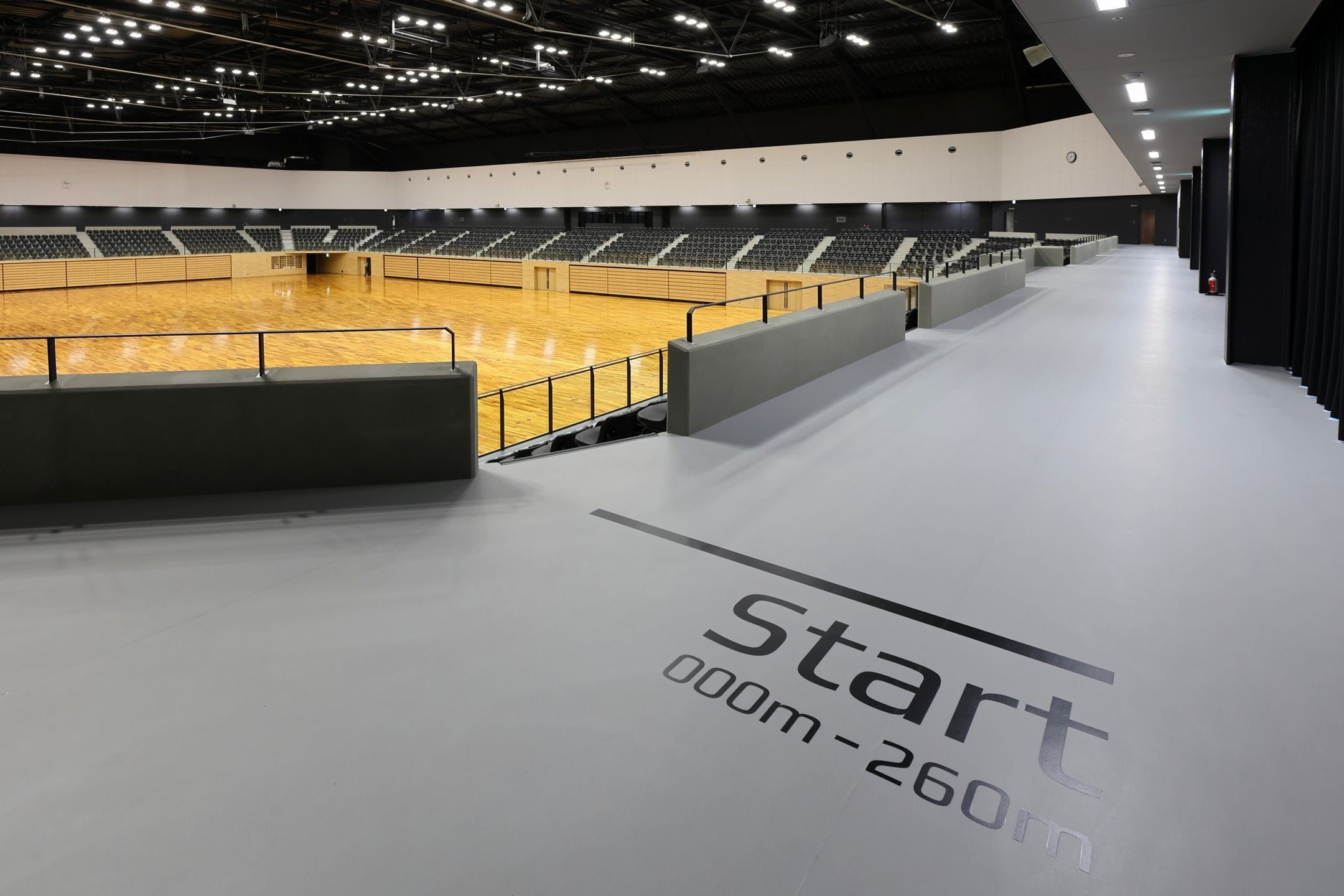 「メインアリーナ」は、バスケットボール3面が確保できる広さがあり各種スポーツ大会やイベントでの利用が可能です。2F席の周りには、全長260mのランニングコースも設置しているため、選手のウォーミングアップ場所としても利用が可能です。観覧席は約5,000席(固定式・可動式・専用車いす席含む)あるため、プロスポーツの興行も可能です。