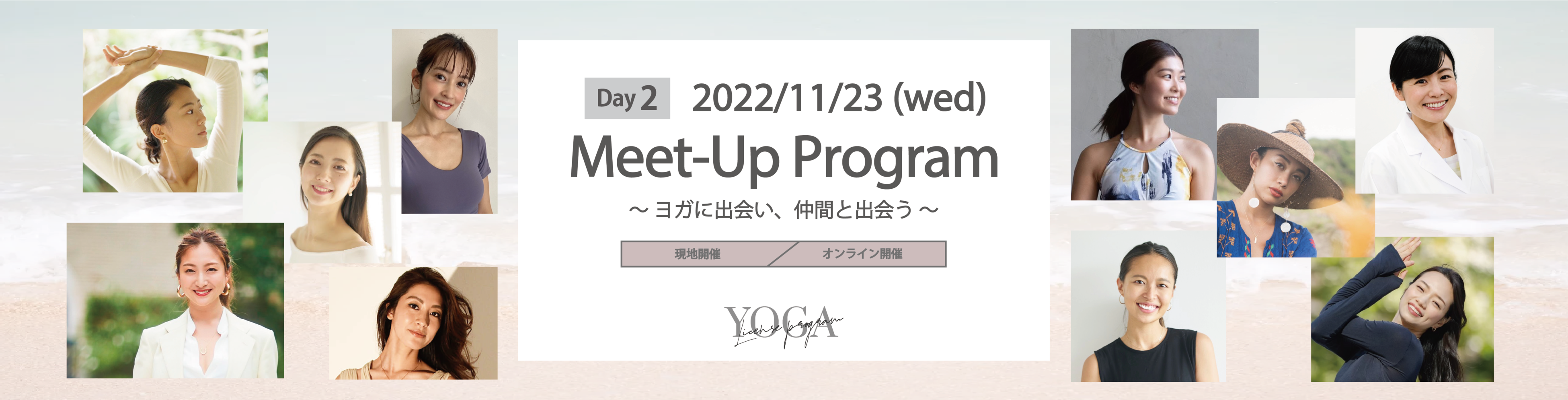 「Meet-Up Program」は、人気講師から直接レッスン&セミナーを受けられ、ヨガが初めての方はもちろん、ヨガインストラクターの方やヨガインストラクターになりたい方など、どなたでもご参加いただけるイベントです。インストラクターとしてのインスタグラムの活用方法や、ヨガ哲学のお話・自己肯定感を高めるワーク、腸内環境を整える美腸ヨガなど、普段では受講できないレッスン&セミナーをご用意しています。