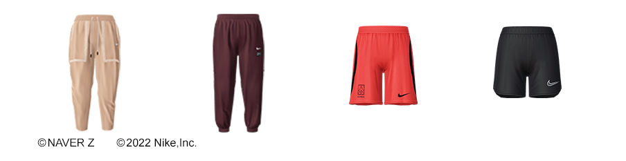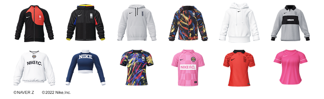 ナイキコリアで展開されている商品を忠実に3Dアイテム化しました。リアルでも購入のチャンスがあるものなので、デジタルとフィジカルでおそろいのコーディネートを楽しむことも可能です。普段私たちが運動する際に身体を動かしやすい服に着替えるように、アバターがワールドで身体を動かすための服として、ぜひワードローブに加えてみてください。