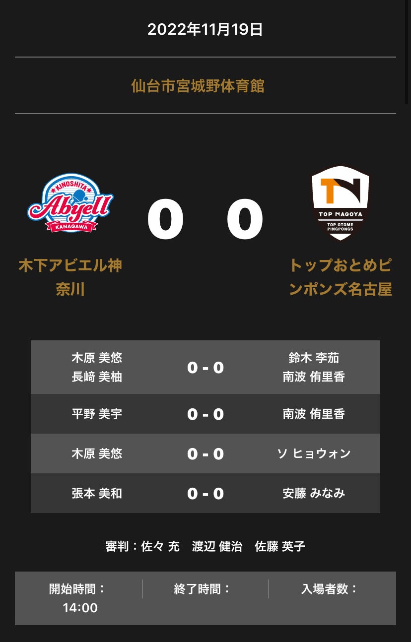 ホームプレスリリース ノジマTリーグ 2022-2023シーズン 公式戦 11月19日開催 木下アビエル神奈川 vs トップおとめピンポンズ名古屋 対戦オーダー発表 2022年11月19日 13時38分 公開|スポーツマニア編集部プレスリリース 一般社団法人Tリーグのプレスリリース ノジマTリーグ 2022-2023シーズン 公式戦 11月19日開催 木下アビエル神奈川 vs トップおとめピンポンズ名古屋 対戦オーダーの発表をします。 会場:仙台市宮城野体育館