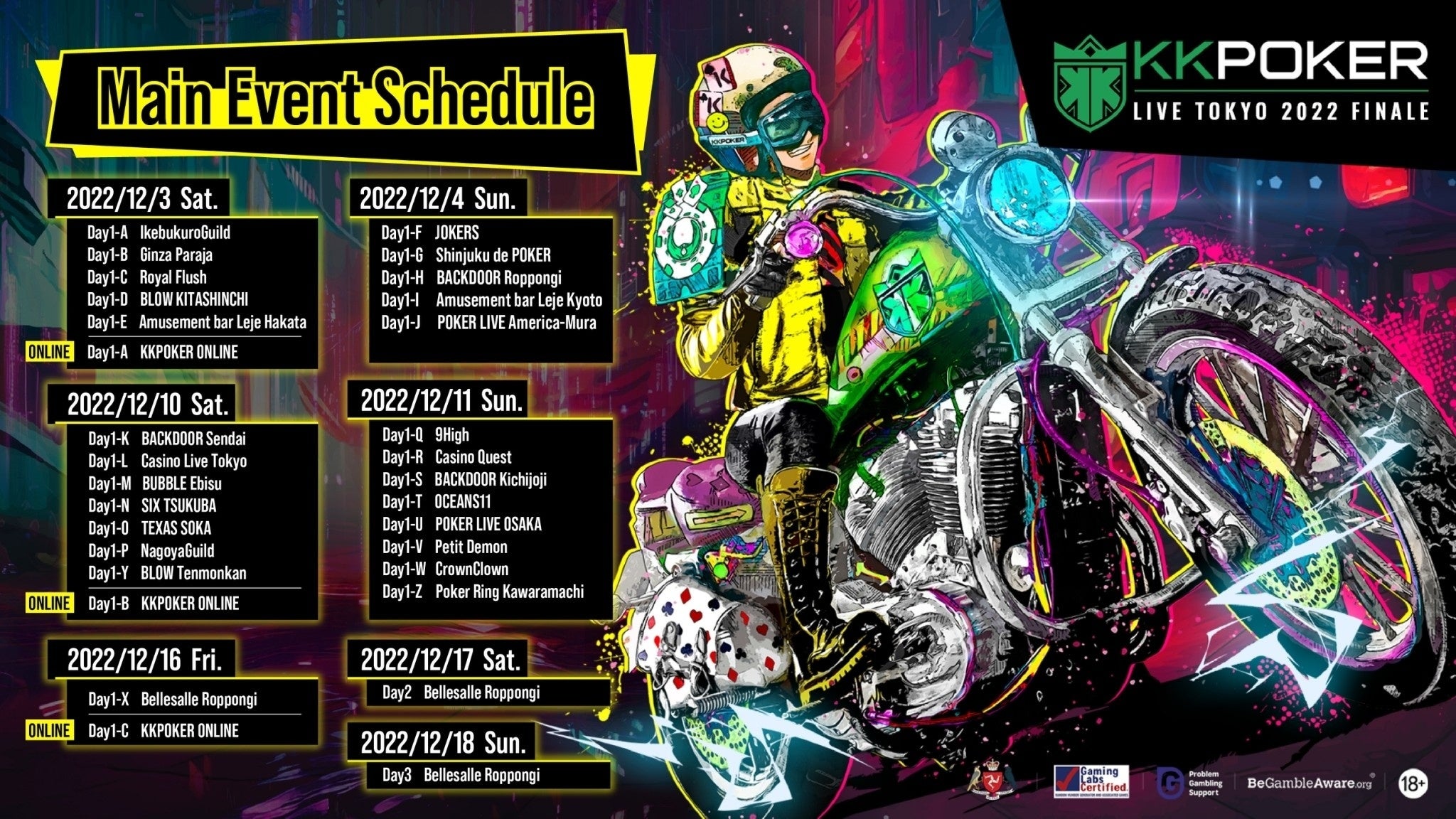 2022.12.16-18日にベルサール六本木でKKPOKER LIVE TOKYO 2022 FINALEを開催。メインイベントは日本のポーカー史上最大の80位から入賞で、スポンサード総額10万ドルのビッグタイトルとなっています。
