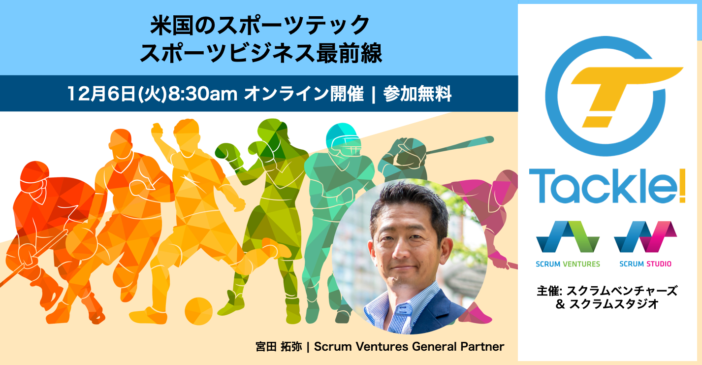 サンフランシスコと東京を拠点にアーリーステージのベンチャー企業に投資を行うスクラムベンチャーズ(ジェネラルパートナー:宮田 拓弥)は、米国の最新スポーツテック、ならびにスポーツビジネスについて解説する勉強会Tackle!を12月6日に開催します。