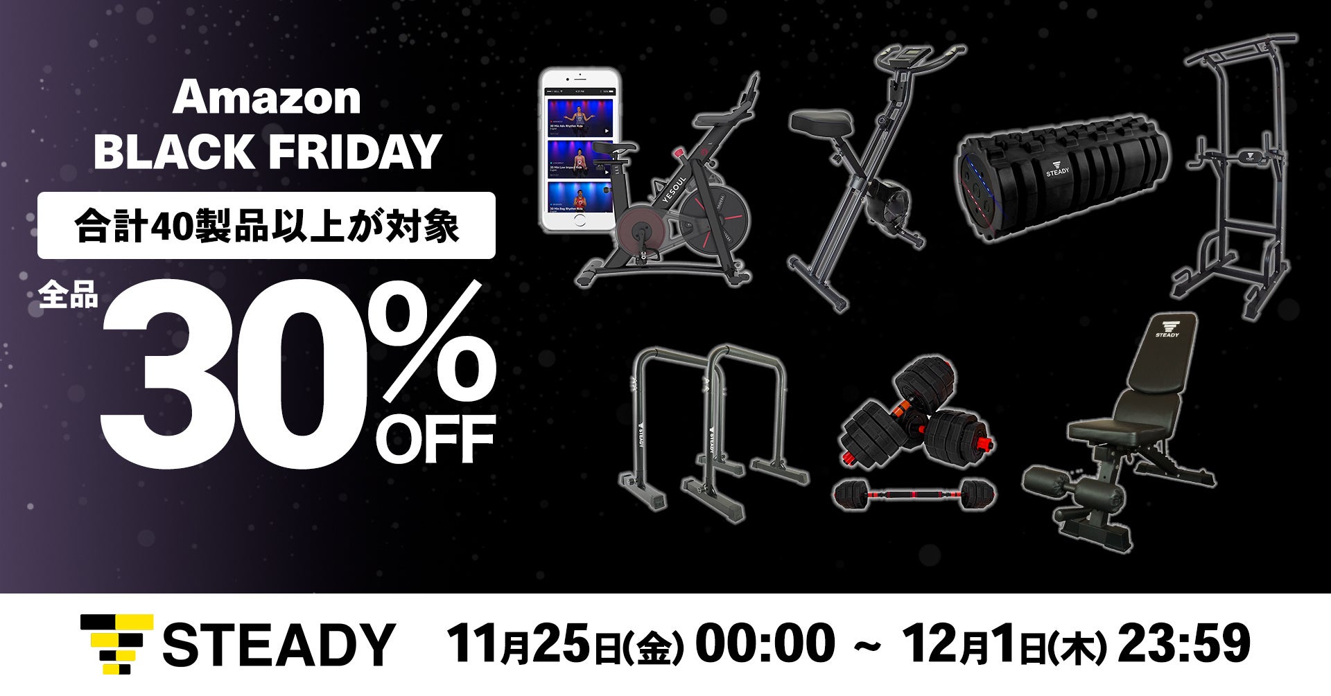 2022年11月25日(金)0:00から12月1日(木)23:59までAmazonにて開催される7日間のビッグセール「Amazonブラックフライデー」において、40以上のSTEADY製品を全品30%OFFにて販売。気温が下がり、屋外でのワークアウトがしづらくなる冬の本格到来前に自宅でのトレーニング環境を充実させられる絶好のチャンスです。