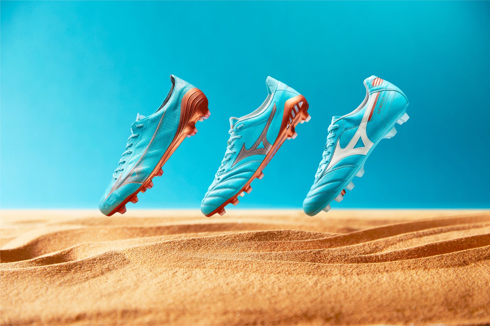 「MIZUNO α JAPAN」は現代フットボールに求められる要素を兼ね備えた、ミズノ史上最もスピードを追求したサッカーシューズ。「MORELIA II JAPAN」は進化を続けるモレリアシリーズの中でも究極のフィッティングを追求したモデル。「MORELIA NEO III JAPAN」は軽量、柔軟、素足感覚をさらに研ぎ澄ませたモレリアネオの第3世代モデルとなっています。
