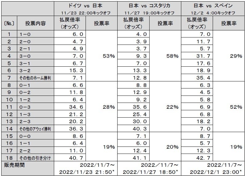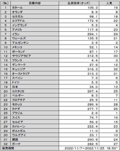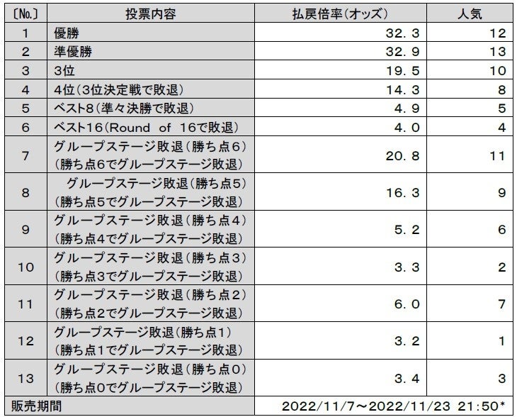 日本がグループリーグを突破して史上初のベスト8まで進出すると予想された投票に基づく払戻倍率(オッズ)は4.9倍!!※3 人気の投票は、グループステージ敗退(勝ち点1)で、払戻倍率(オッズ)は3.2倍に。