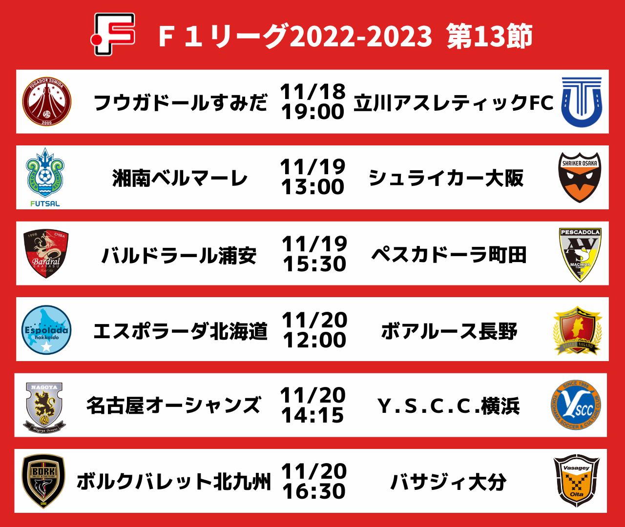 11月18日(金)~20日(日)にFリーグ2022-2023 ディビジョン1 第13節の6試合を開催いたします。