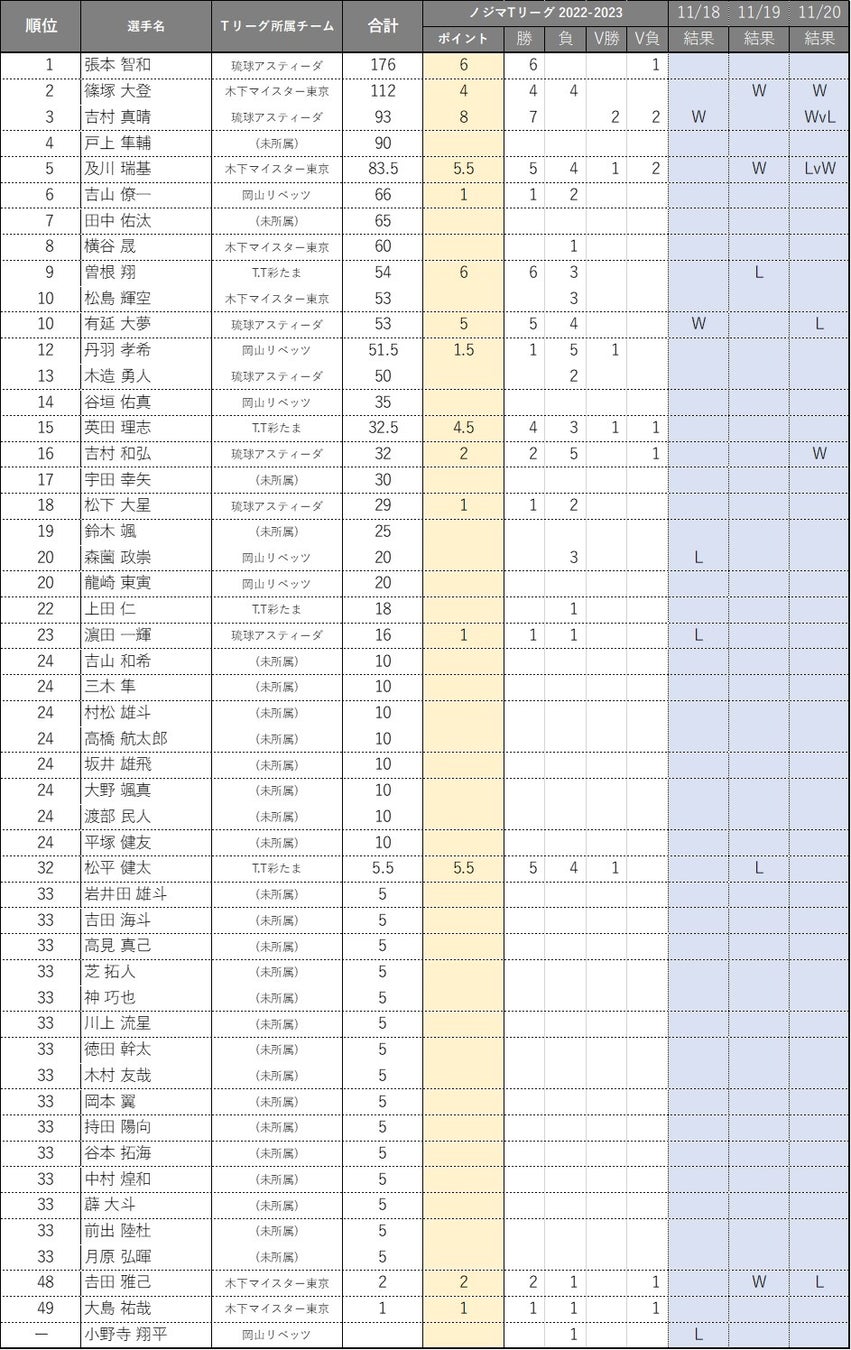 ノジマTリーグ 2022-2023シーズンにおける、「2024パリオリンピックシングルス選考ポイント 」の獲得状況をお知らせします。(ノジマTリーグ 2022-2023シーズン公式戦 11/20開催試合終了時)