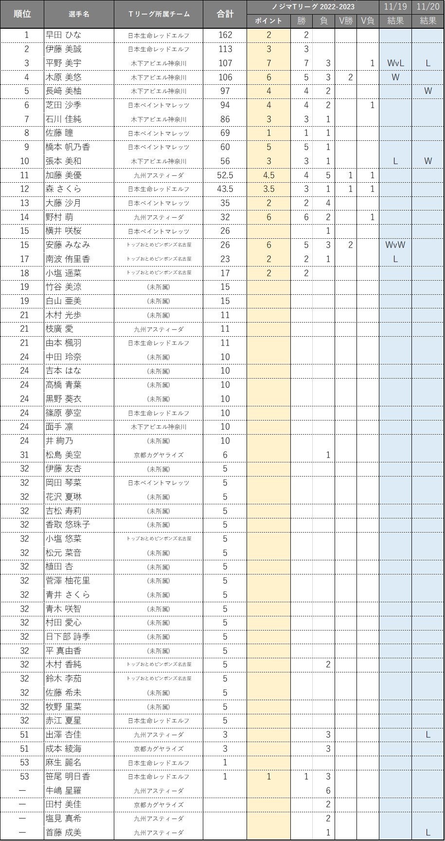 ノジマTリーグ 2022-2023シーズンにおける、「2024パリオリンピックシングルス選考ポイント 」の獲得状況をお知らせします。(ノジマTリーグ 2022-2023シーズン公式戦 11/20開催試合終了時)