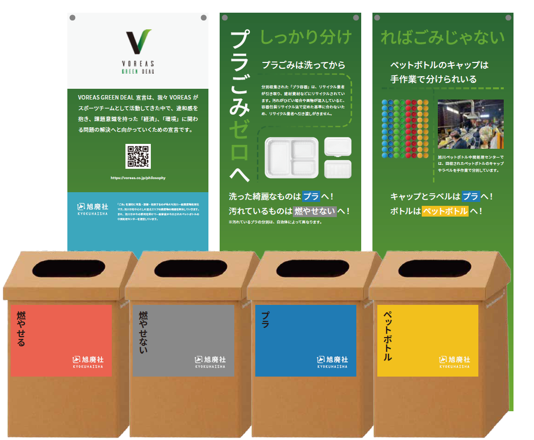 V.LEAGUE DIVISION2 MEN所属のプロバレーボールチーム「ヴォレアス北海道」を運営する株式会社VOREAS(代表取締役社長 池田憲士郎、以下VOREAS)と株式会社一般廃棄物処理社(代表取締役 湯野信一、以下 旭廃社)は、2022−23V.LEAGUE DIVISION2MEN のヴォレアス北海道の主管試合(全8試合、以下ホームゲーム)において、「プラごみゼロ」を目指し、分別ゴミ箱の設置とゴミ分別の啓蒙動画放映を共同で行います