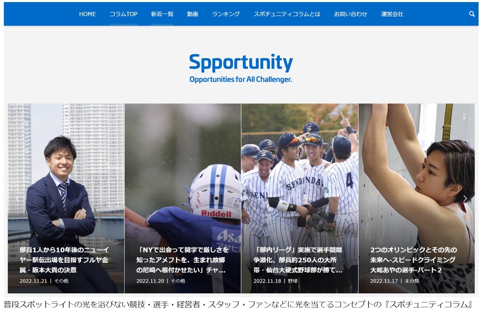 スポチュニティでは、普段スポットライトを浴びる機会の少ない競技やチーム、アスリート、スタッフ・裏⽅、ファンへ 光を当 て、そこにあるストーリーや熱い想いを世の中に届けることをコンセプトとした『スポチュニティコラム』(http s://media.spportunity.com/)を運営しております。