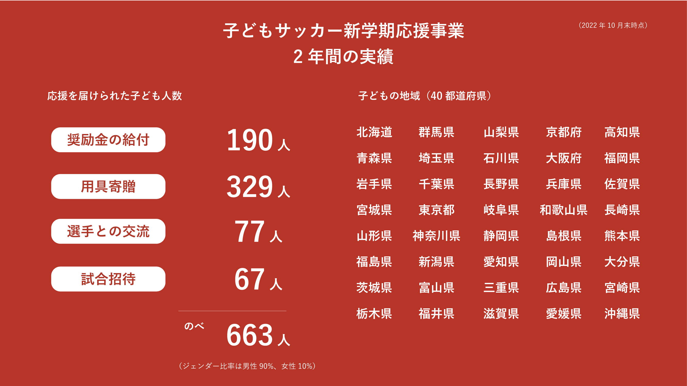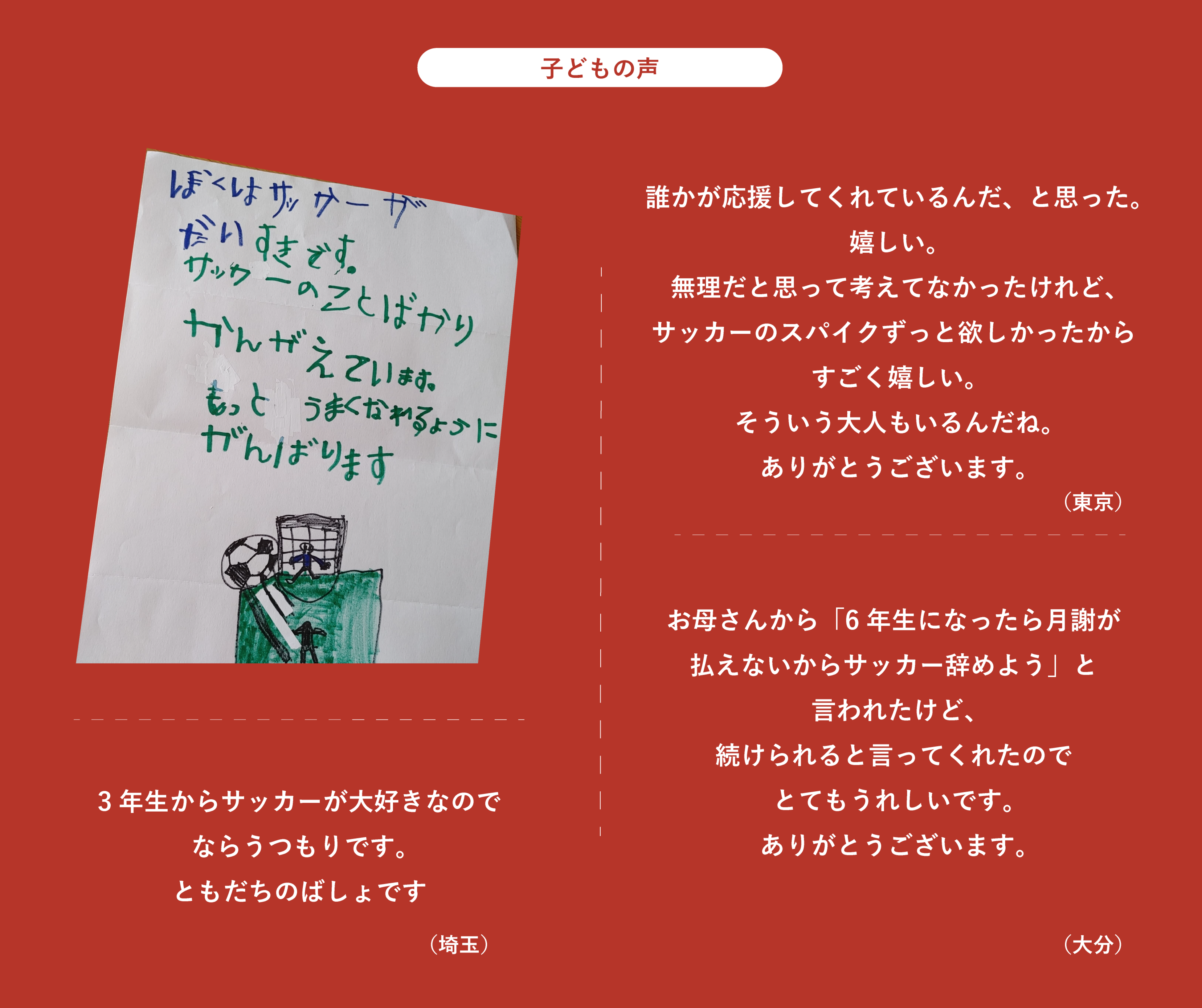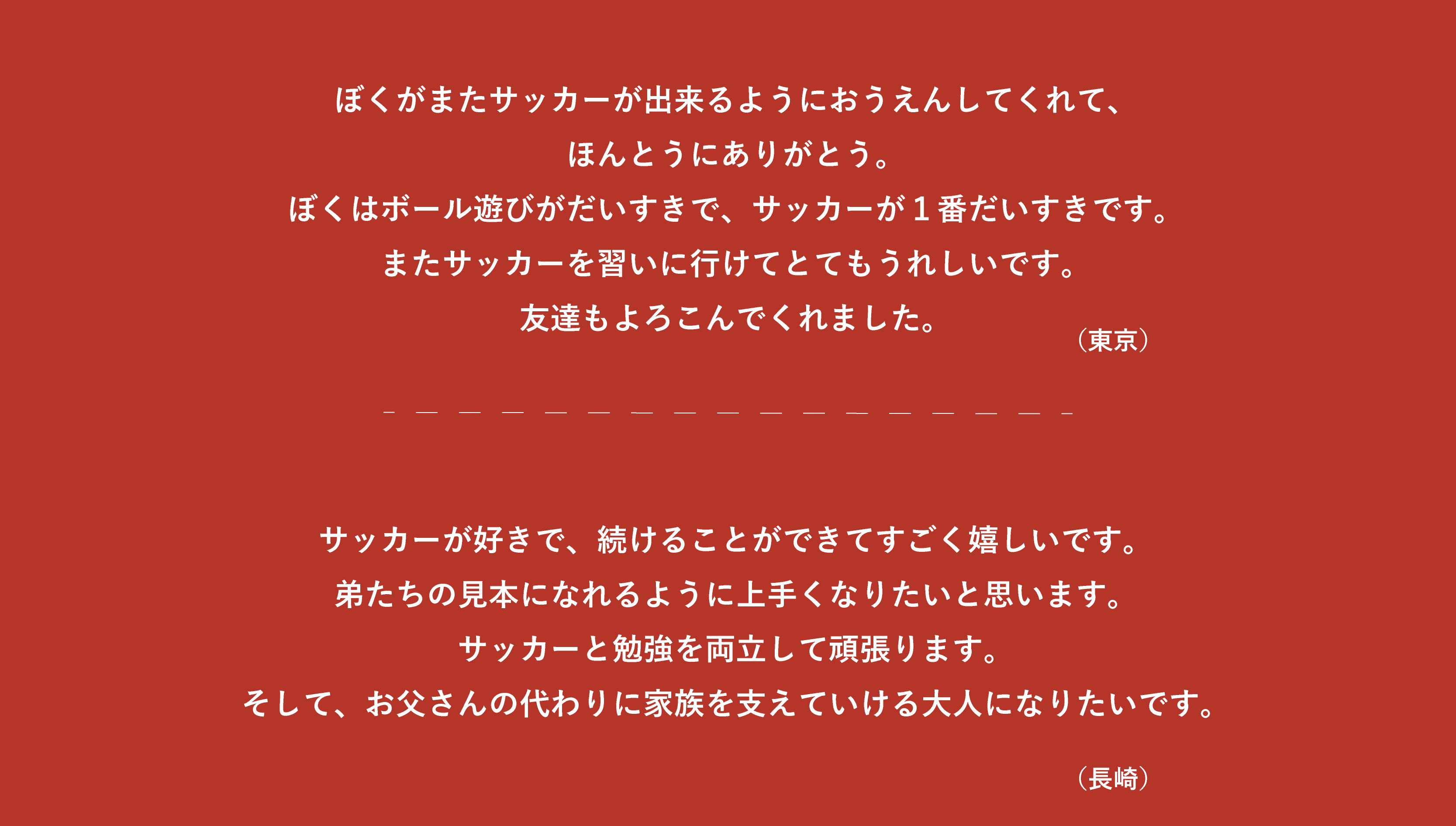 そこで、子どもたちが安心して新学期を迎え、サッカーを楽しめるように、サッカーの費用に使える奨励金5万円の給付、ウェアやシューズ等用具の寄贈を行います。また、申請者及び受益者に対する調査活動を行い、必要な情報を日本サッカー界の主たる組織と共有し、より包括的な応援体制の構築を目指します。