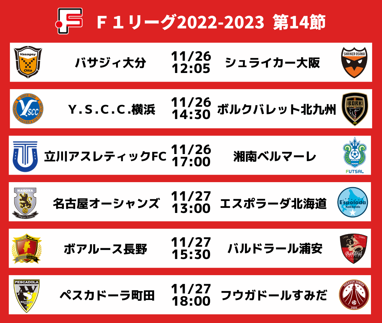 11月26日(土)、27日(日)にFリーグ2022-2023 ディビジョン1 第14節の6試合を開催いたします。