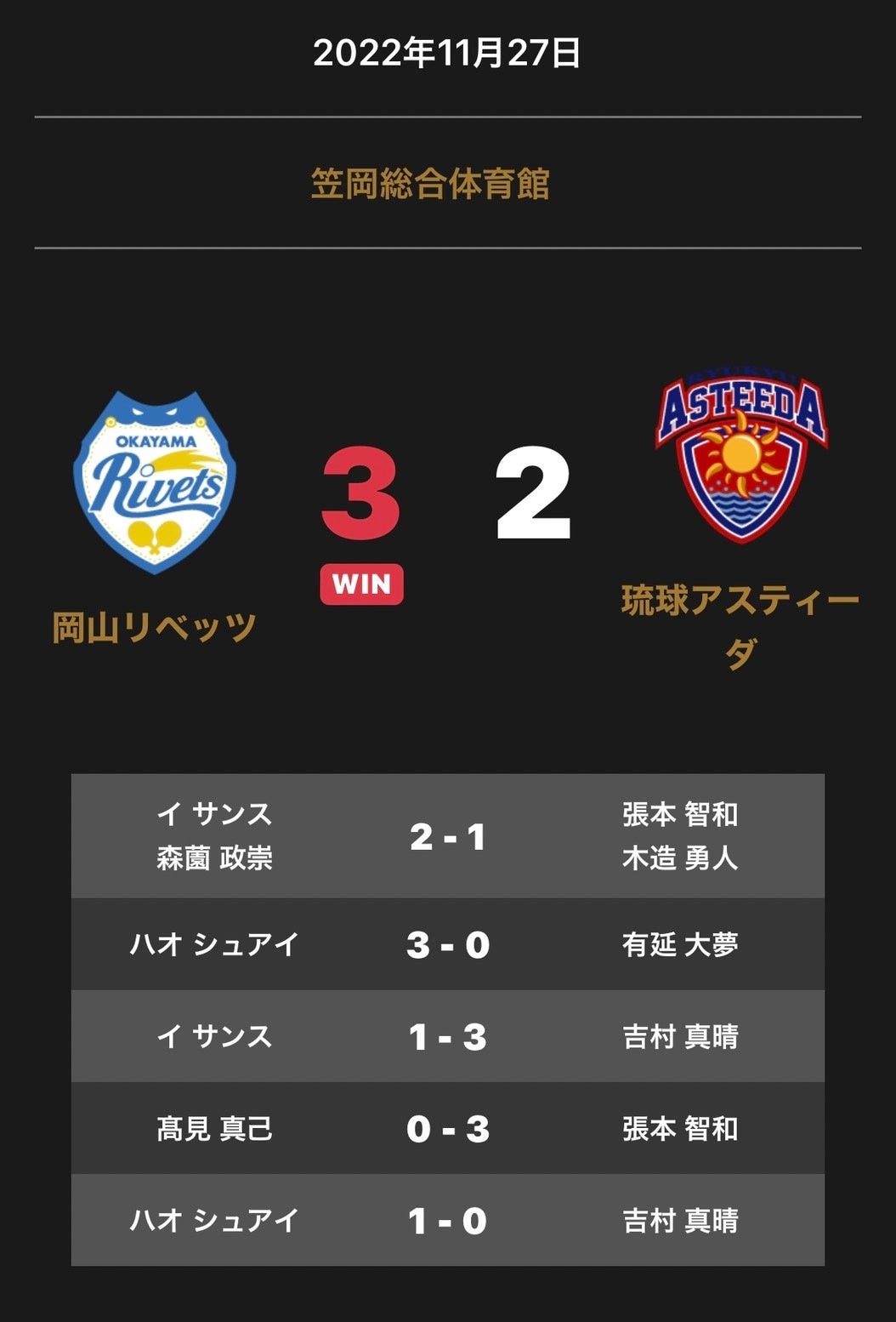 ホームプレスリリース ノジマTリーグ 2022-2023シーズン 公式戦 11月27日開催 岡山リベッツ vs琉球アスティーダ 試合結果 2022年11月27日 17時08分 公開|スポーツマニア編集部プレスリリース 一般社団法人Tリーグのプレスリリース 11月27日(日)13:00 試合開始 岡山リベッツ vs 琉球アスティーダ 会場:笠岡総合体育館(岡山県) 岡山リベッツと琉球アスティーダの試合は3-2で岡山リベッツが勝利しました。