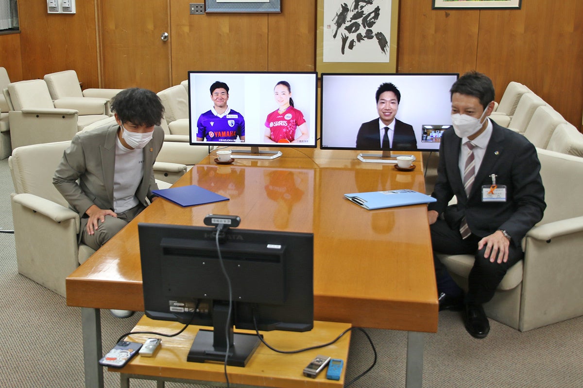 令和4年11月28日(月曜)、森岡陸選手が市役所を訪れ、草地市長から代表して委嘱状を受け取りました。委嘱式では、水谷隼氏がリモートで出席し、伊藤美誠選手からはメッセージで参加していただきました。
