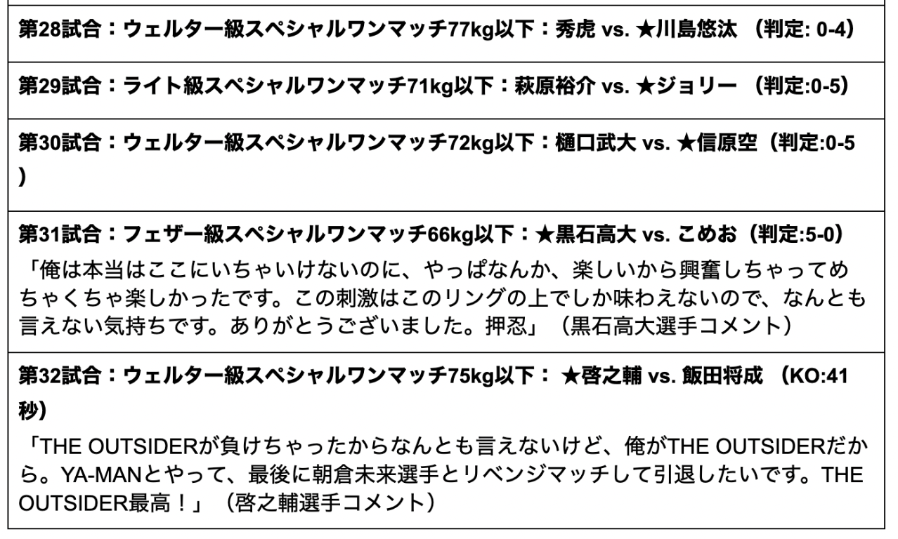 また、他にも「前回出演させていただいた時よりもクオリティの高い試合がたくさん見られて感動しています」(安藤美姫さん)、「今まで見てきた格闘技の中でも一番興奮しました。ありがとうございました。」(明日花キララさん)などのコメントが寄せられました。