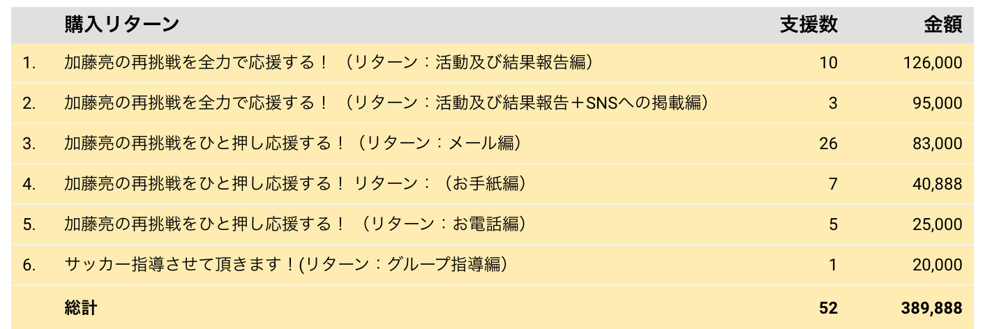 なお、ご支援を頂きましたそれぞれのリターン(支援返礼品)は順次、加藤選手からご送付させていただいております。