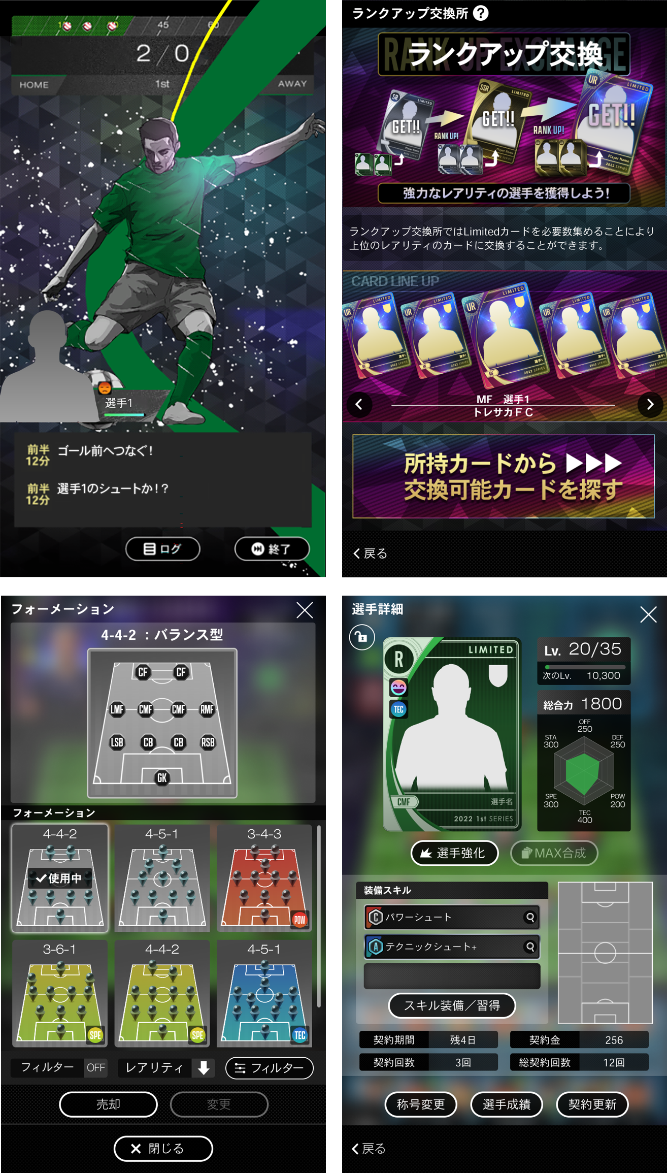 – 入手した選手カードおよび、選手カードのレアリティ、レベル、スキルデータ