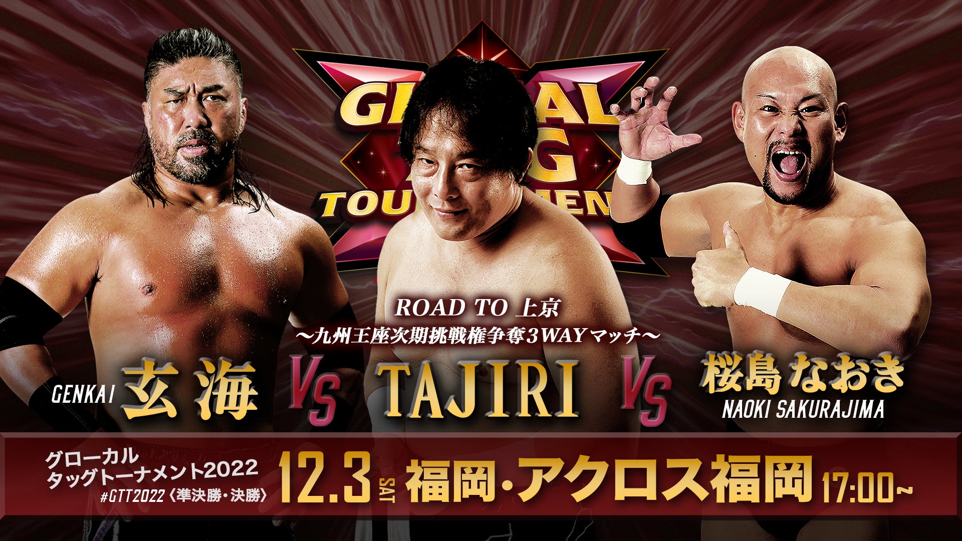 ”プロレス界のメジャーリーガー”TAJIRI、玄海、桜島なおきが九州プロレス選手権試合の次期挑戦権を賭けた3WAYマッチも行う。