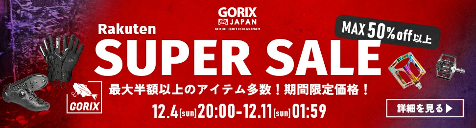 GORIX株式会社(所在地:大阪市東淀川区、代表取締役:長野明)の自転車パーツブランド「GORIX」は、楽天市場店にて12/4(日)20:00~12/11(日)1:59に楽天スーパーSALEを開催。期間中は割引クーポンも配布。バーテープ、サイクルスタンド、空気入れ、ポーチ、バッグなどが「最大83%OFF」となる楽天ビッグセールです。