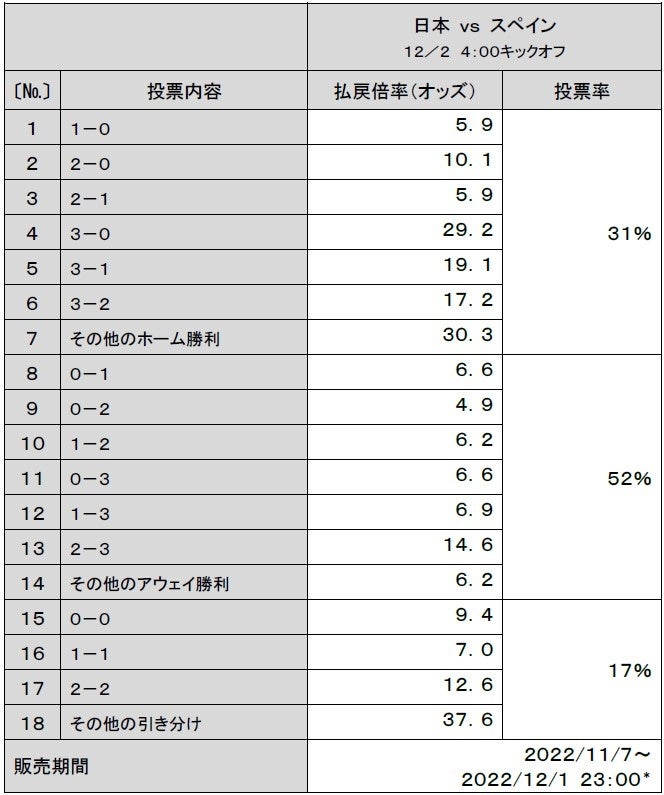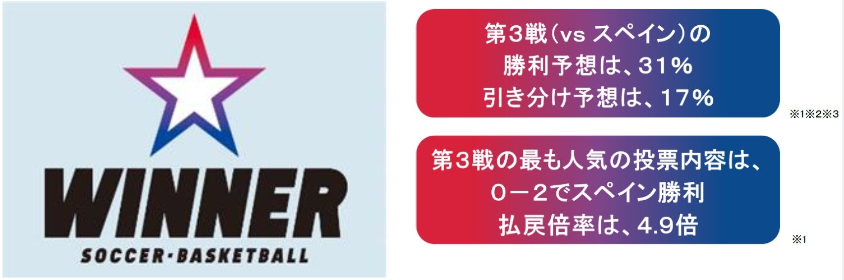 ・第3戦(vs スペイン)の日本の勝利予想は、31%※2、引き分け予想は17%※3。人気の投票は、0-2でスペイン勝利で、払戻倍率(オッズ)は4.9倍!