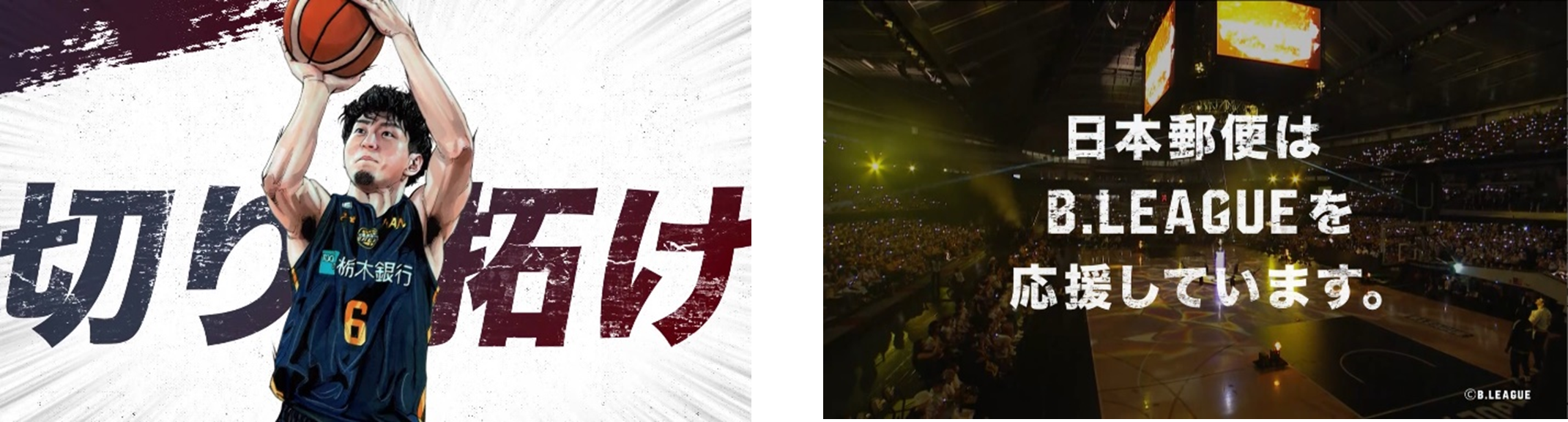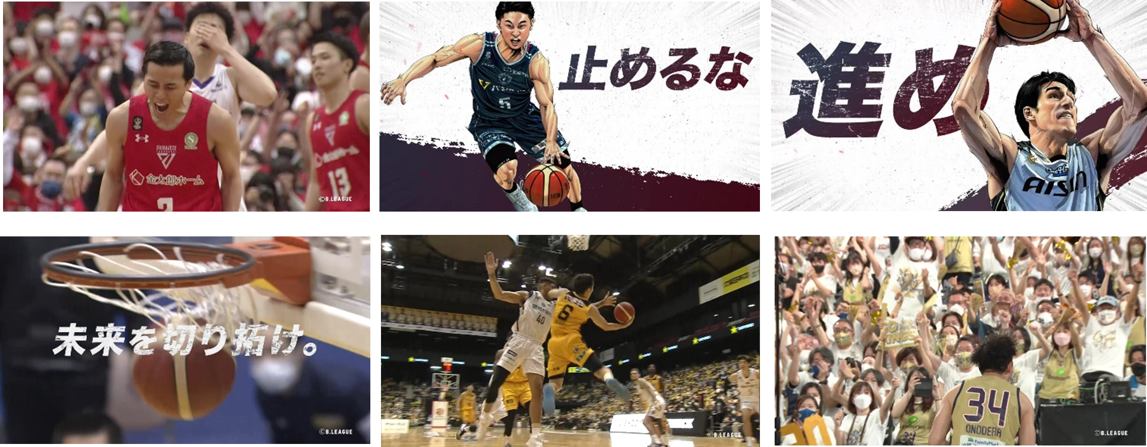 B.LEAGUE選手の勝利に向けたドリブルやシュートのシーン、観客の熱狂的な応援のシーンを採用し、「その熱い想いを」「止めるな」「進め」「未来を切り拓け」のキャッチコピーを体現しています。