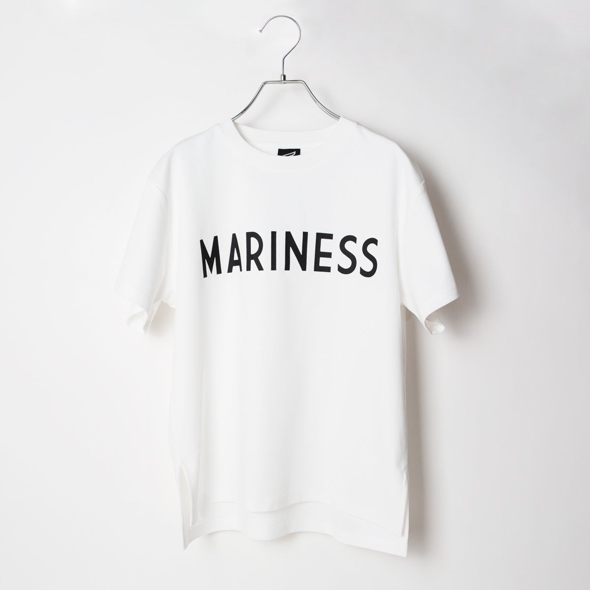 白地にMARINESSのブラックの大きめのインパクトのあるロゴがプリントされたビッグロゴTシャツです。ラウンドネックの襟元にドロップショルダーのシルエットのサラリと着ることができる半袖Tシャツです。