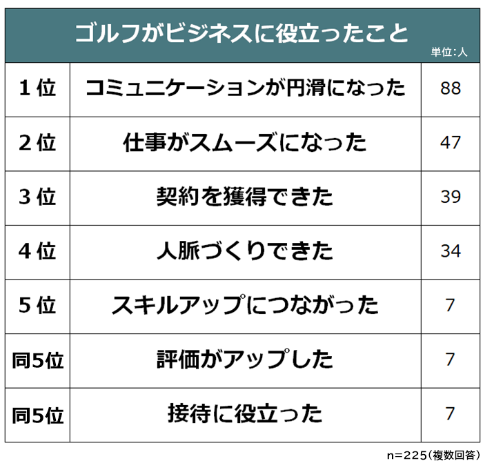 社会人のゴルフ経験者225名に「ゴルフがビジネスに役立ったこと」を聞いたところ、1位は「コミュニケーションが円滑になった(88人)」でした。