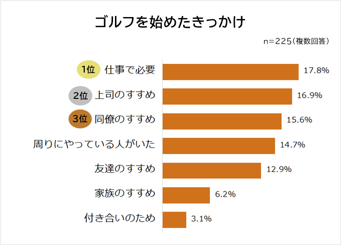 社会人のゴルフ経験者225名に「ゴルフを始めたきっかけ」を聞いたところ、1位は「仕事で必要(17.8%)」でした。