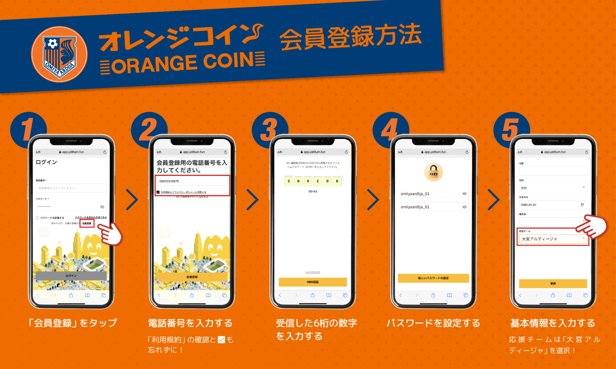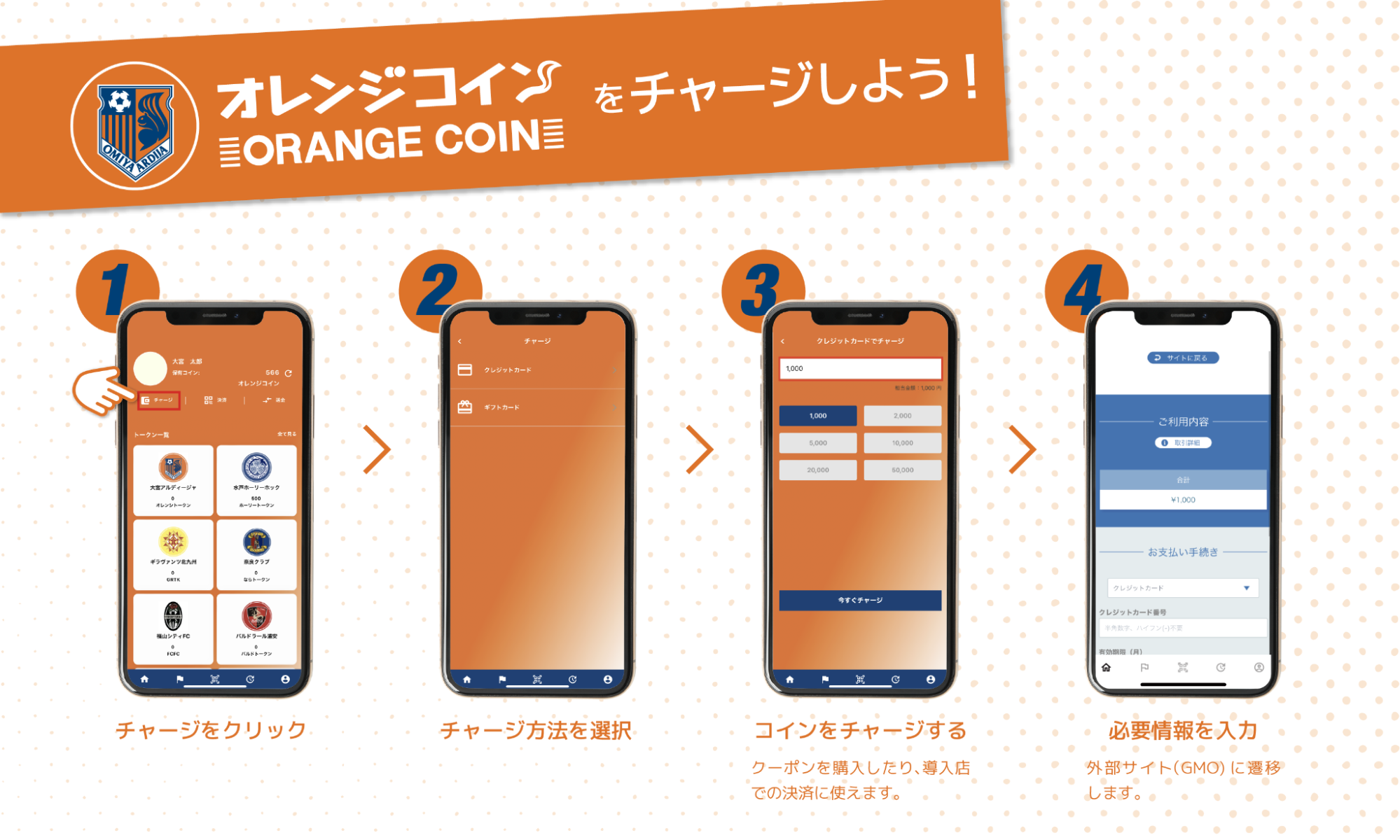 以下のサイトよりご登録後、応援チームで「大宮アルディージャ」を選んだ後、「オレンジコイン」をチャージして、決済にご利用ください。