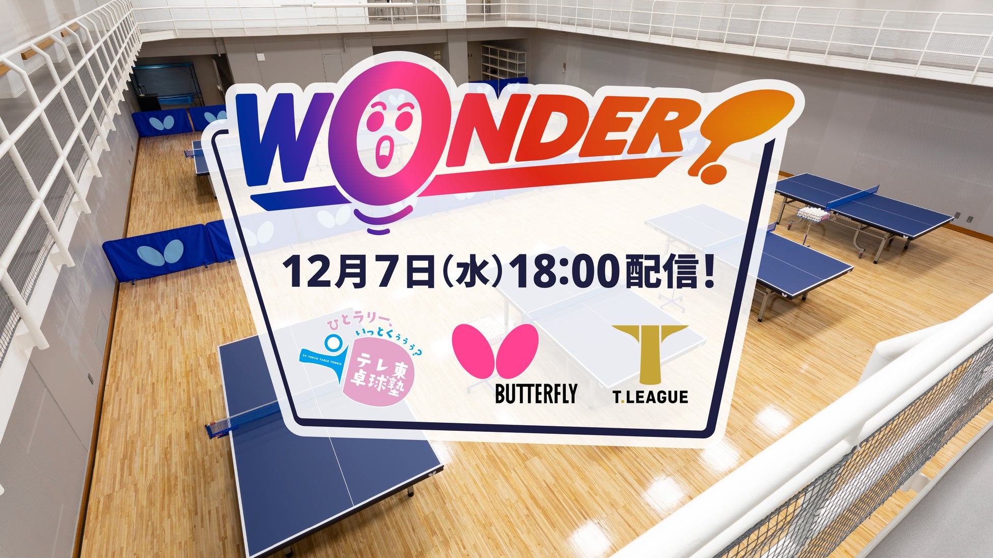 バタフライとTリーグ、テレ東卓球塾とのコラボレーション企画「WONDER」では、Tリーグの各チームを代表する選⼿たちが、「初めてのWONDERな経験」をテーマに、珠⽟のエピソードをYouTubeで公開します。12⽉7⽇(⽔)午後6時には、BUTTERFLY 公式チャンネルで動画を配信いたします。