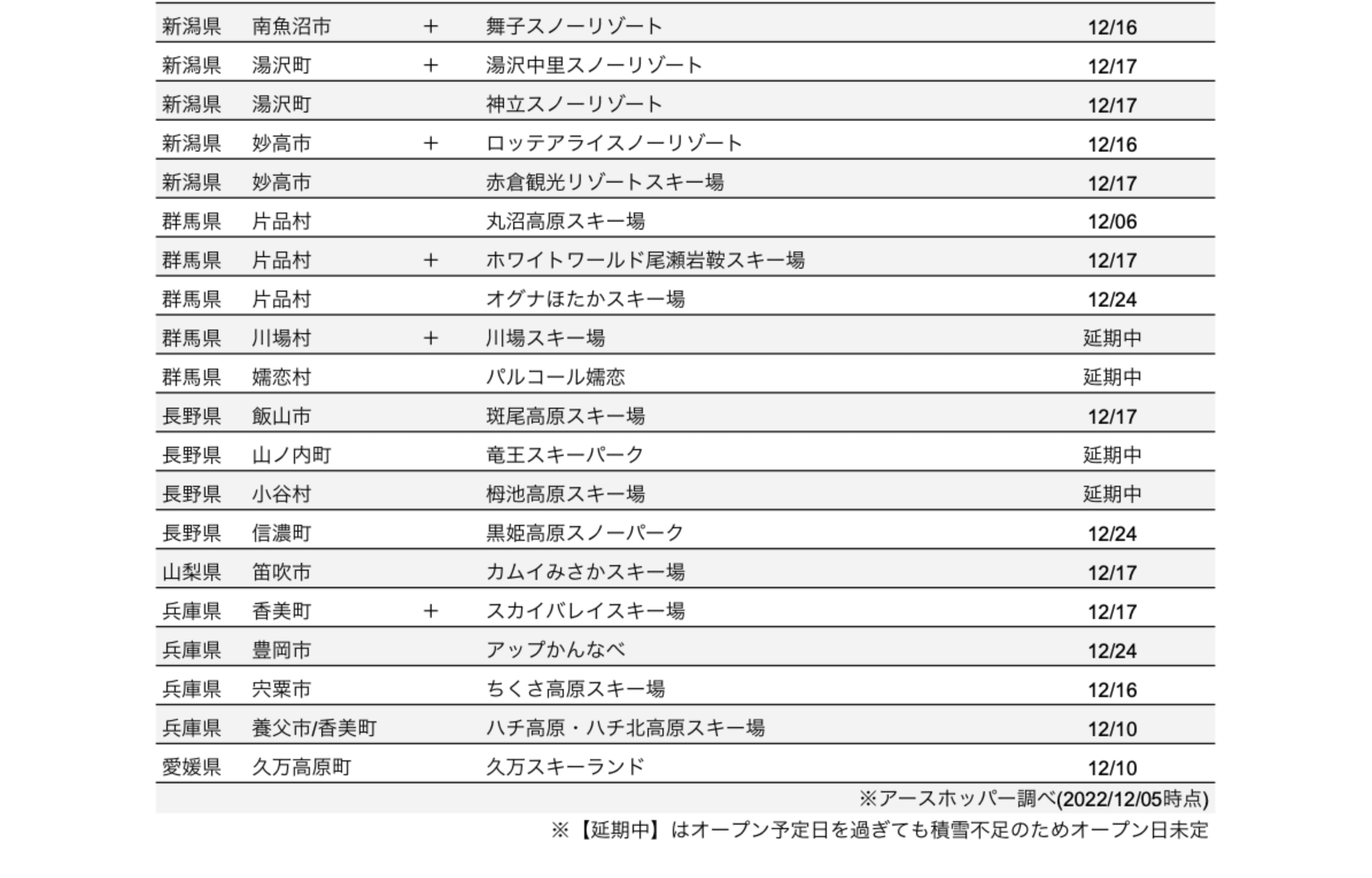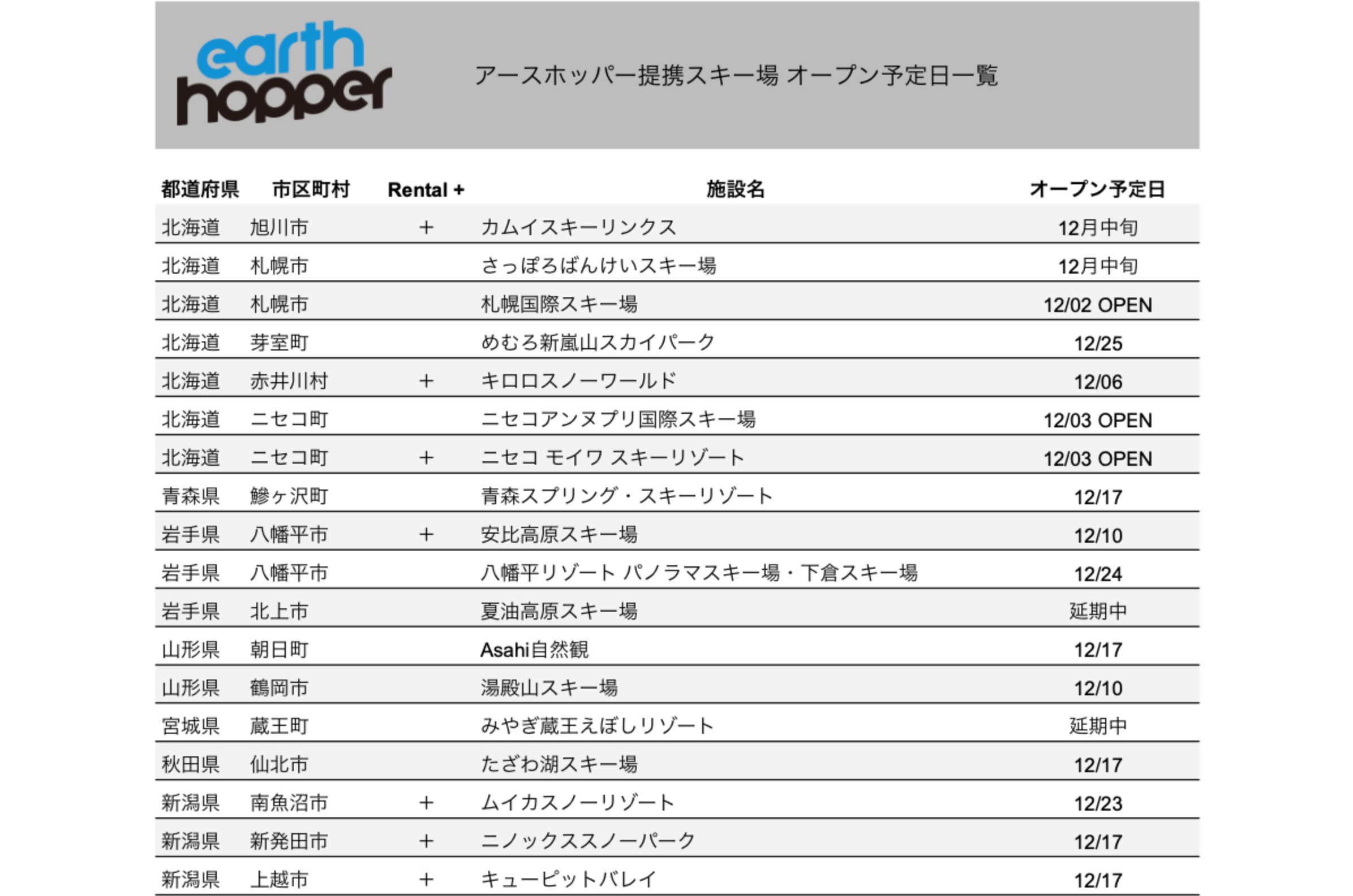 ■最新版のアースホッパー提携スキー場オープン予定日一覧を公開