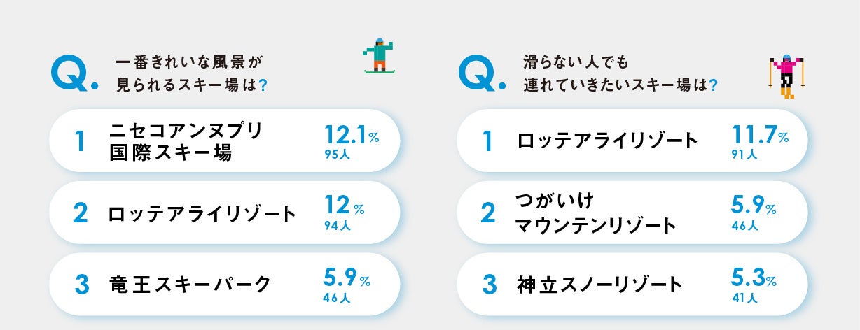 豪華なリゾート施設をもつ「ロッテアライリゾート」が1位に選ばれ、初心者でも滑りやすい良質な雪に恵まれながらもビギナーコースなどが充実した2つのスキー場が続きました。