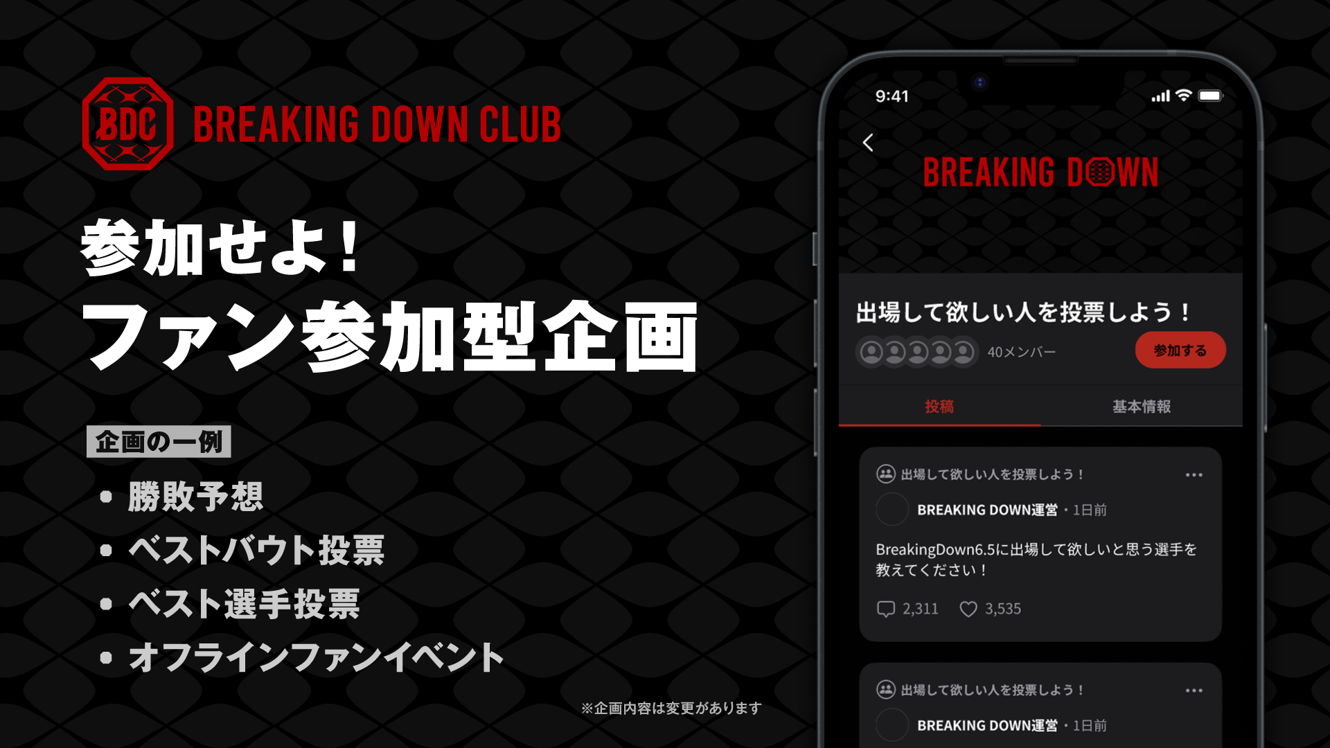 ベスト試合、MVP選手を自分で選ぶことができる企画や、本戦・オーディションをより盛り上げるためのアイデアを出し合う企画など、アプリを通じてBreakingDownの運営の一員になることができます。