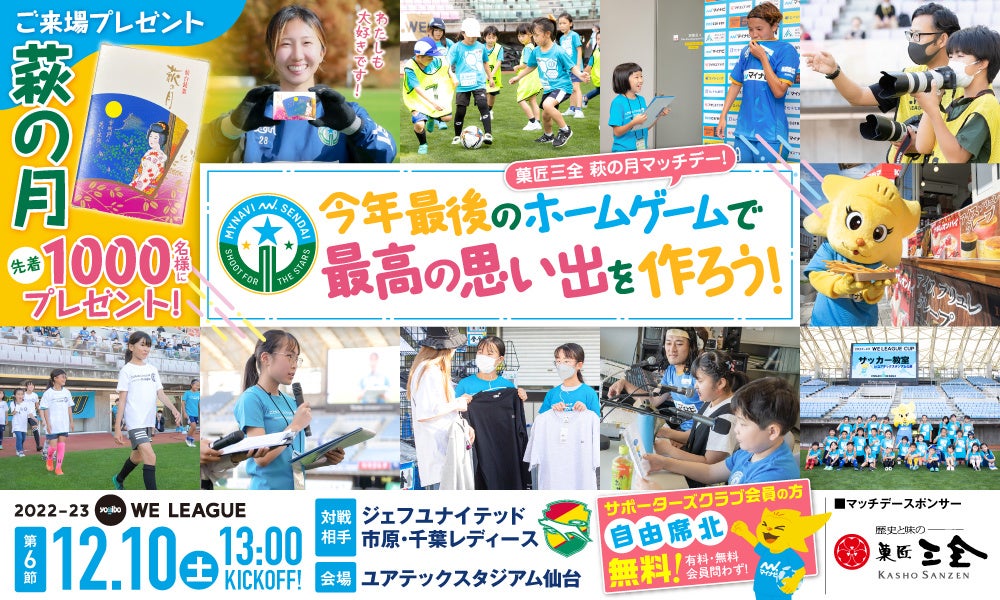 マイナビ仙台レディースでは、12月10日(土)ユアテックスタジアム仙台にてYogiboWEリーグ第6節 ジェフユナイテッド市原・千葉レディース戦を開催します。