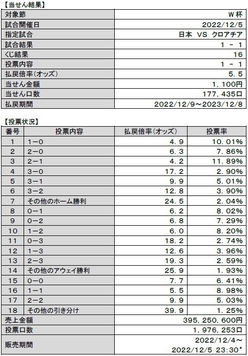 ■「WINNERサッカー1試合予想(日本 vs クロアチア)」のくじ結果