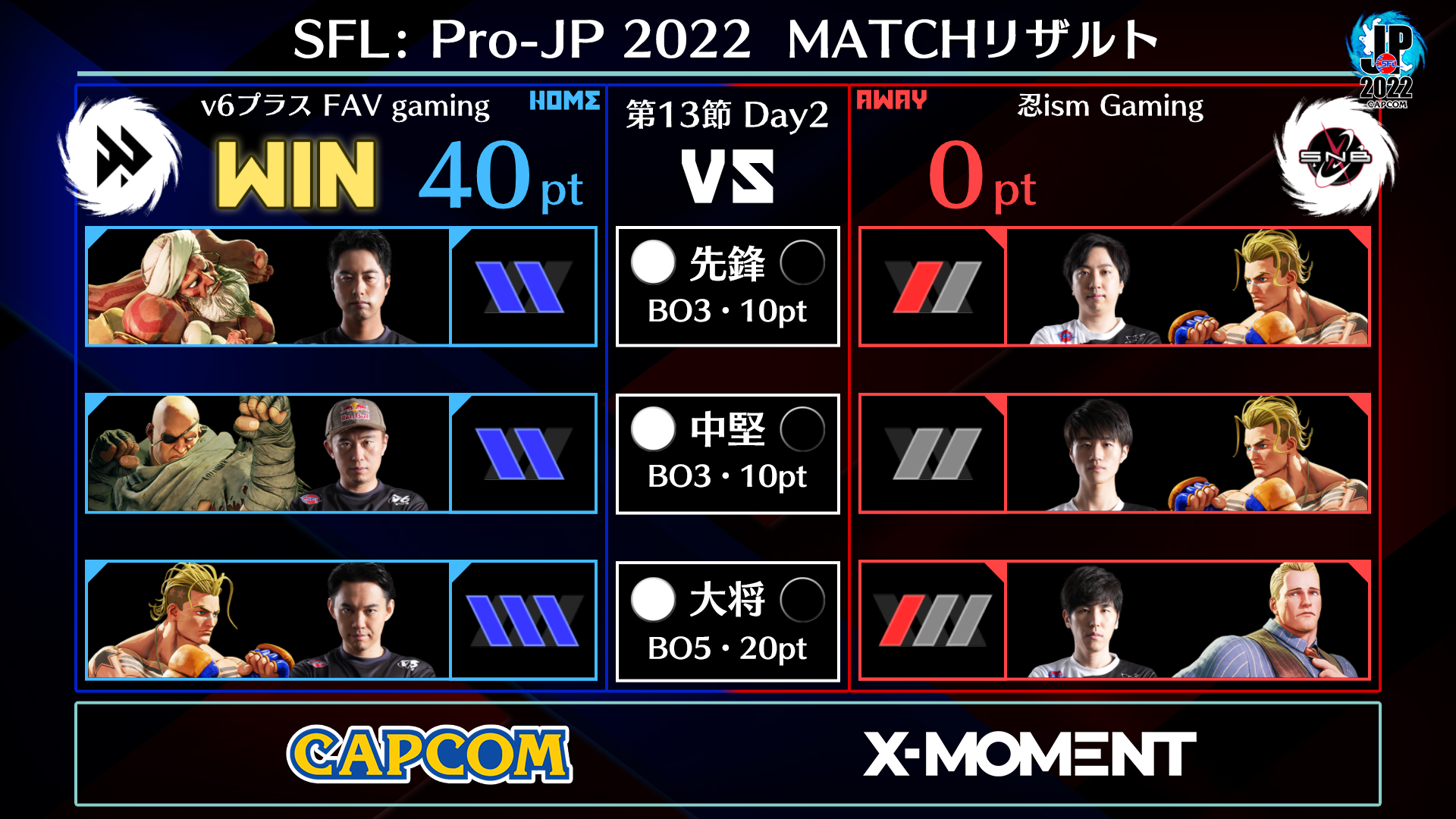 - MATCH 2:ホーム「v6プラス FAV gaming」vs「忍ism Gaming」アウェイ