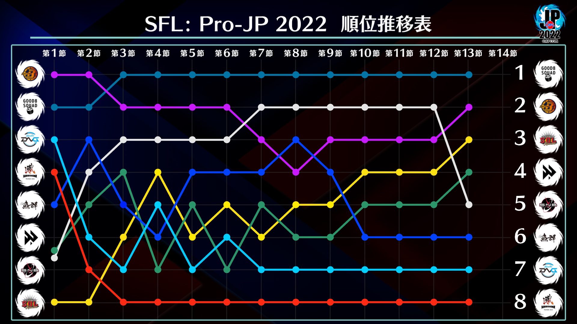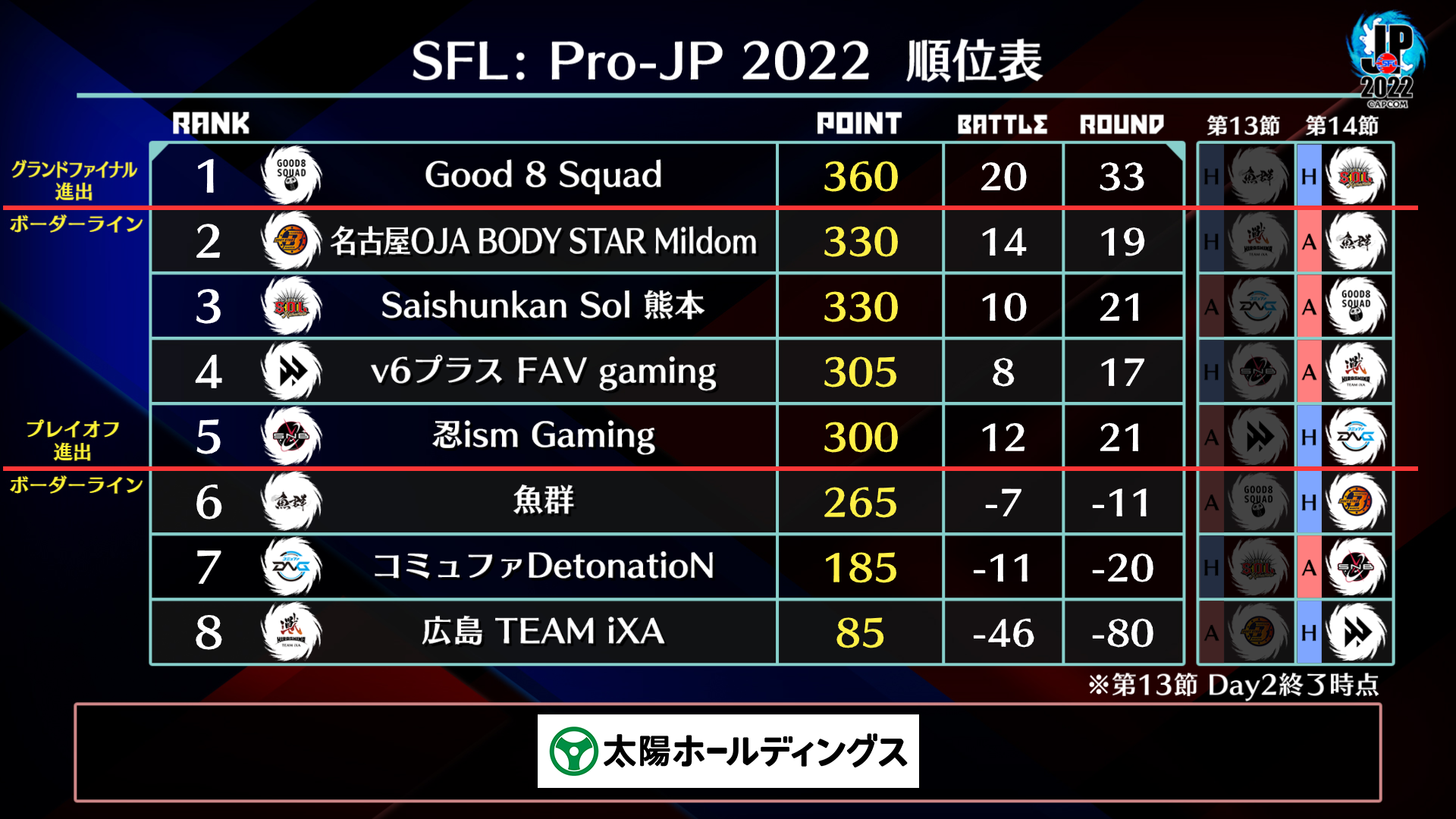 「ストリートファイターリーグ: Pro-JP 2022」リーグ本節終了後、本節2位から5位のチームが「プレイオフ」へ進出、さらに「プレイオフ」を勝ち上がった上位2チームと、本節1位のチームが決勝大会である「グランドファイナル」へ進出し、2022年シーズンの優勝と、総額800万円の賞金を懸けて激突します。