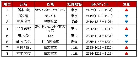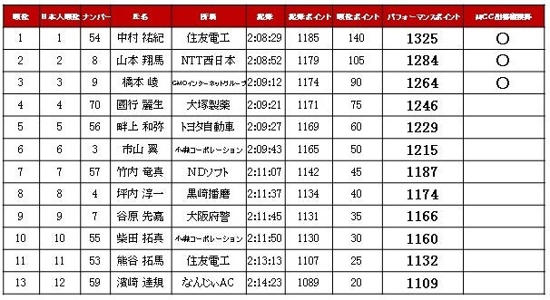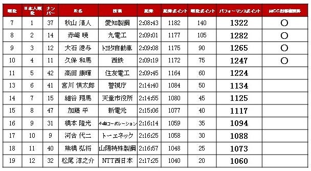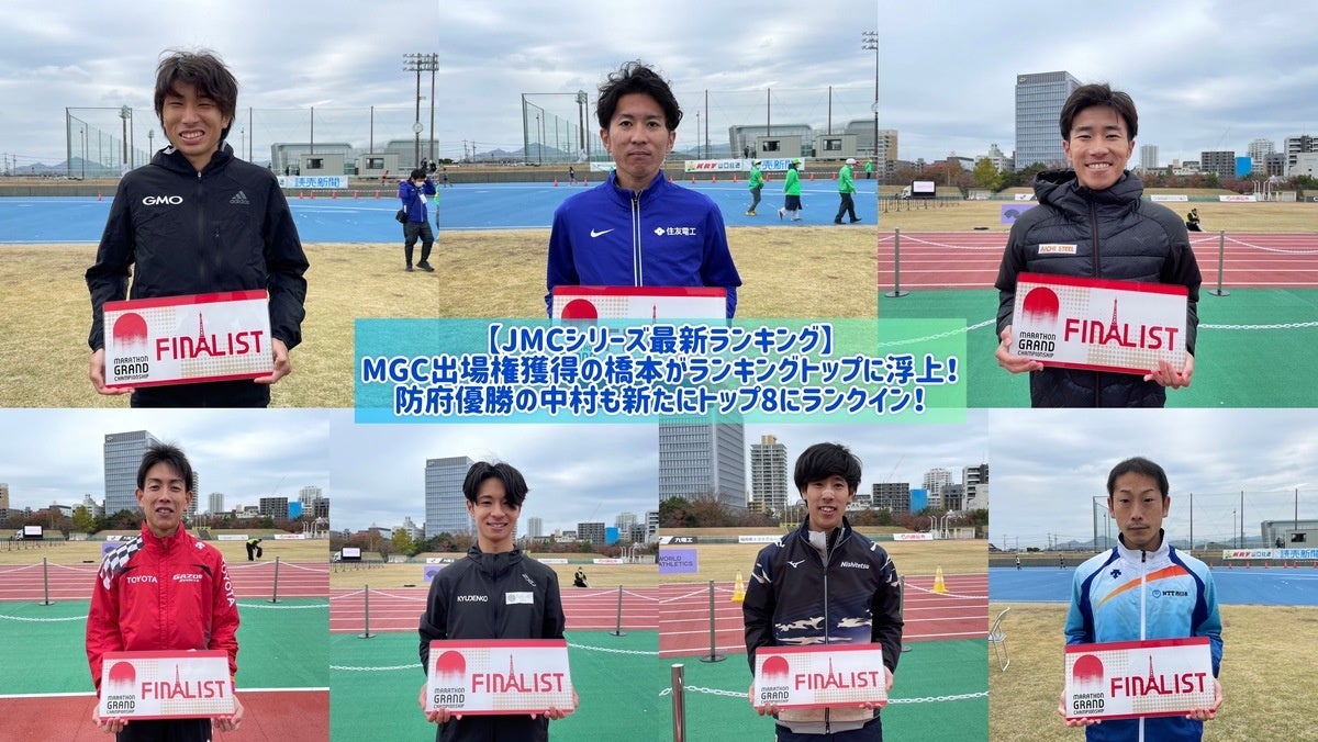 JMCシリーズⅡポイントランキングには、防府読売マラソンで3位に入りMGC出場権を獲得した橋本崚(GMOインターネットグループ)が1位に浮上。また、同大会で優勝した中村祐紀(住友電工)・川内優輝(あいおいニッセイ同和損保)が新たにランクイン。