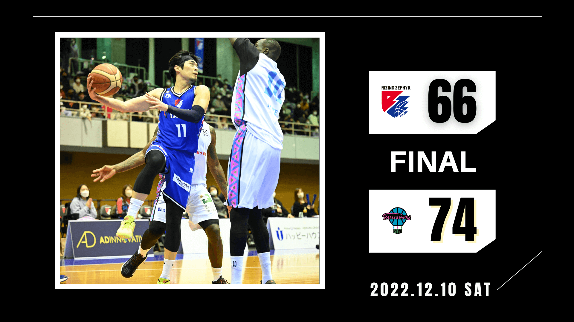 後半に入っても勢いのある佐賀の攻撃に苦戦した福岡は#32ゴードンのインサイドでの得点から流れを作ると#6大塚のゲームメイクから♯11白戸が連続得点し、一気に同点に追いつく。逆転を狙う福岡はディフェンスから流れを作るが、要所のリバウンドとフリースローを決めることができなかった福岡は佐賀に惜敗した。