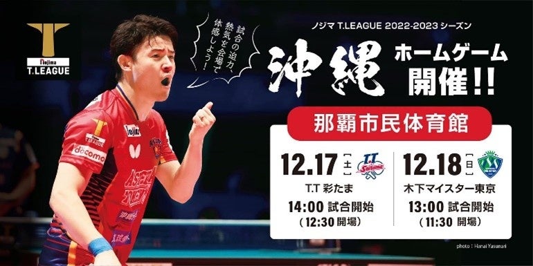 今回のホーム戦は、先日世界ランク2位の快挙を遂げた張本智和選手のほか、沖縄県うるま市出身の県出身初のTリーガー上江洲光志選手らが出場・ベンチ入りを予定。王座奪還を目指した白熱した試合と世界トップレベルのプレーに注目です!また、クリスマスを目前に卓球を通じた夢を子どもたちに届けるために、試合終了後に特別に参加選手との記念撮影やサイン会などの交流タイムを設けさせていただきました。